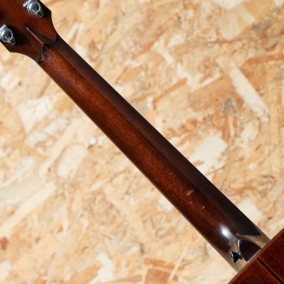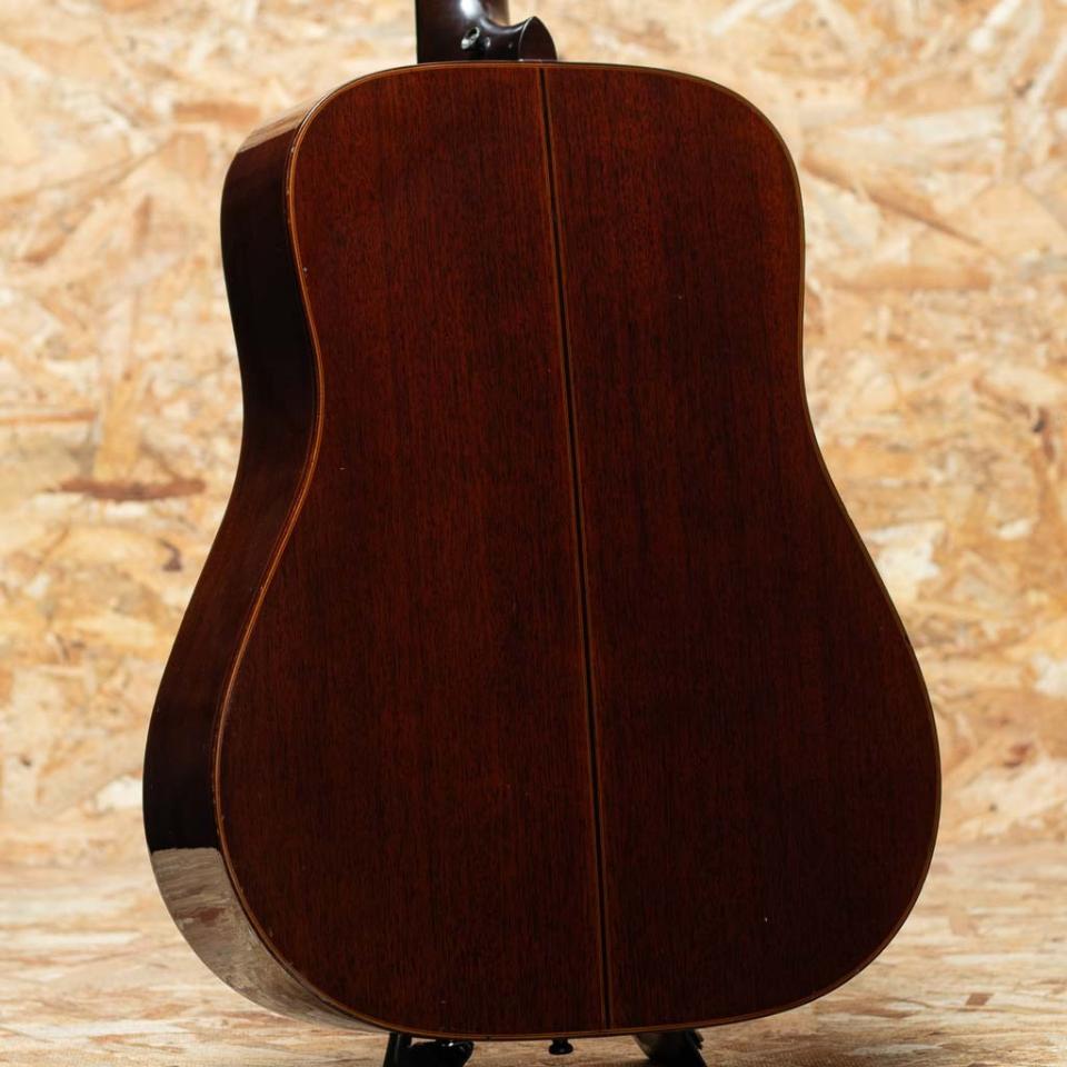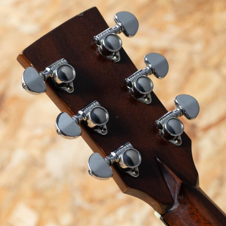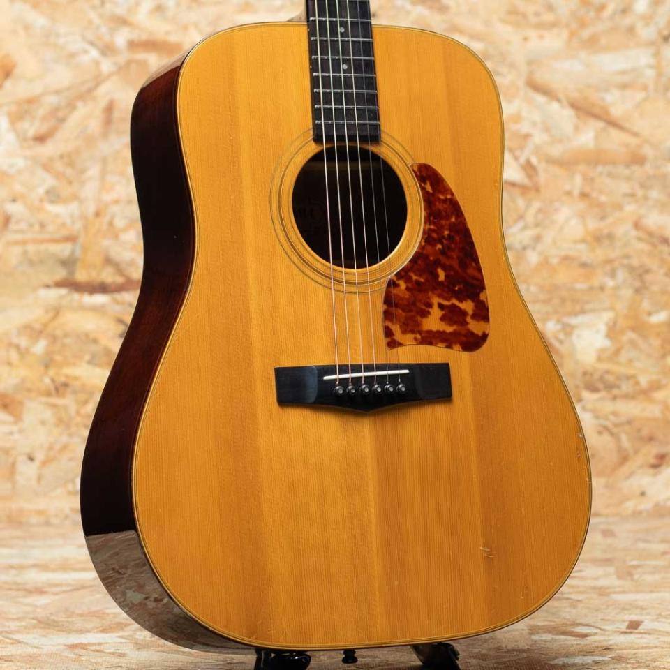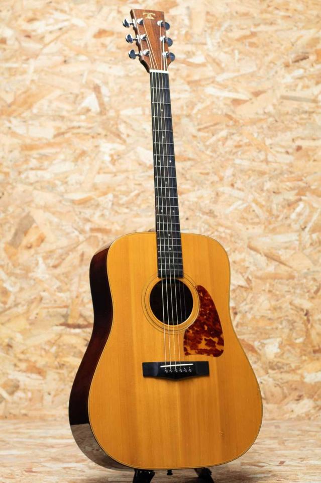 現在はドラムブランドとして圧倒的な認知を誇る"TAMA"。1970年代にはアコースティックギターの製作も行っていました。本器はその短期間のみ製作されていた時期の1本、定番ドレッドノートサイズの"TG-80"。ジャーマンスプルーストップ、マホガニーサイド&バック、エボニー指板&ブリッジ、オリジナル塗り込み本べっ甲ピックガード、グローバー102Cペグ、複合ウッドトリム&ロゼッタ、ウッドバインディング、ノンスキャロップXブレーシングネックヒールストラップピン搭載。トラスロッドはナットの下に搭載されているため、固定されておりません。パワフル且つサウンドレンジの広い豊かな響きが特徴的です。輪郭のはっきりとした明瞭なトーン、ピックでかき鳴らせばガリンガリンにはじけて鳴る爽快サウンド、爪弾けば存在感のありながら上品できらびやかな音色を奏でます。少し丸みのあるVシェイプネックに43.5mmナット幅仕様で、収まりも良く握り込みのしやすい印象です。年代相応の傷や使用感はございますが大きなダメージはなく約半世紀の時を使い込まれてきた貫禄のある外観に仕上がっています。ネックコンディションは良好、現代的なプレイアビリティに整えられており扱いやすい1本です。汎用ハードケースが付属します。