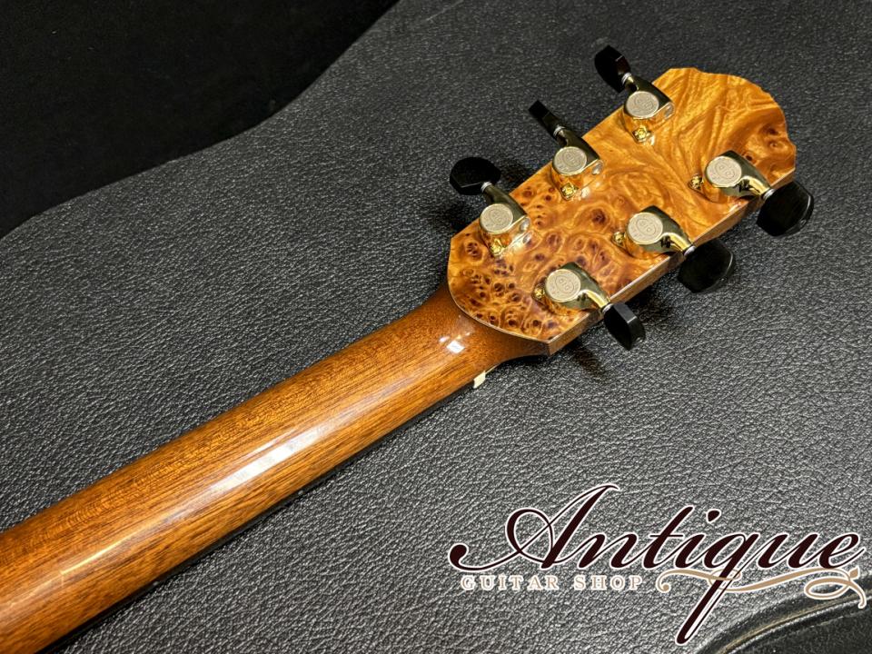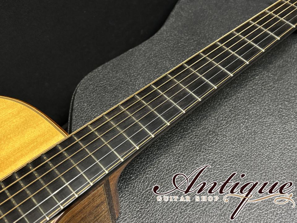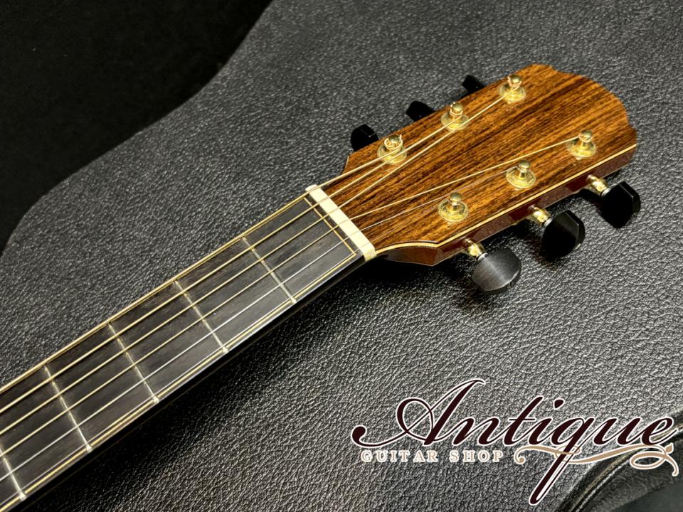 まずそのスペックとしては、オリジナルデザインであるドレッドノートのカッタウェイスタイルにて、ボディトップにはヨーロピアンスプルースが単板にて採用されておりますが、非常に端正で美しい杢目に加え、濃淡のコントラストが強く、部分的にアディロンライクな太い導管の部分も見られる極上材となっております。ボディサイド&バックには、インディアンローズウッドが採用されており、こちらもストレートな柾目取りに加えて、角度によってフレイムフィギュアドを感じさせる素晴らしい材を使用。ネックにはヴィンテージでもお馴染みのホンジュラスマホガニーを、指板には今ではどこのブランドも確保が難しくなってきている高級材エボニーにウッドパーフリング、ヘッドトップはインディアンローズウッドとフィギュアドメイプルをラミネイトした突板を、ヘッドバックにはエキゾチックなバール材が採用されております。その他としては、ボディサイズにマッチしたサイズのダウンベリーのエボニーブリッジ、ブリッジピンにはアバロンドットの装飾、サウンドホールにはマルチリングのロゼッタにて中心部は美しい発色のアバロンとなっております。ボディトップ&バック共にボディ材のローズウッドよりもコントラストの強いウッドバインディングが施され、ヒールキャップにはダイヤモンドスタイルのアバロンインレイのワンポイントが入っております。ピックガードはクリアのティアドロップ、ハードウェアはゴールドにて現在のペグはGotoh 510を搭載。細部スペックとしては、X-ブレーシング、ナット幅は約44mm、適度な厚みのDプロフィール、645mmスケール、Martinドレッドノート同様の645mmスケールに14Fジョイントの20F仕様と、アーヴィン・祖茂木氏のDNAを継ぎながら、独自のサウンドに対しての熱意を感じさせる内容となっております。