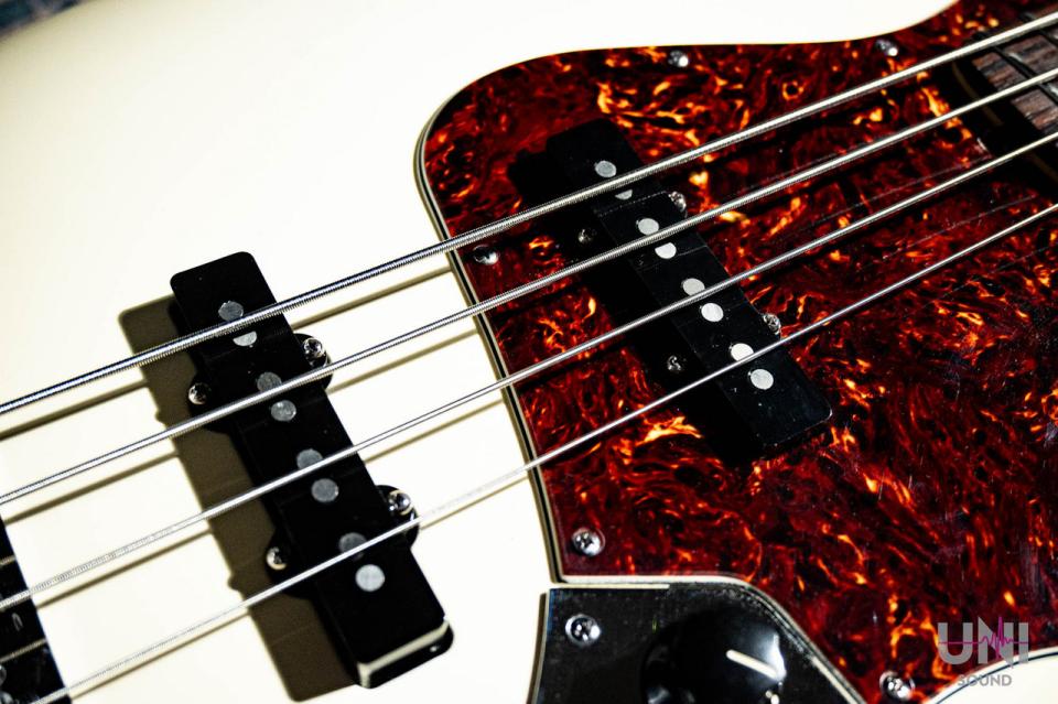 アルダーボディにドットポジションマークのローズ指板、メイプルネックというルックス的には60’sJBを意識した仕様ですね。