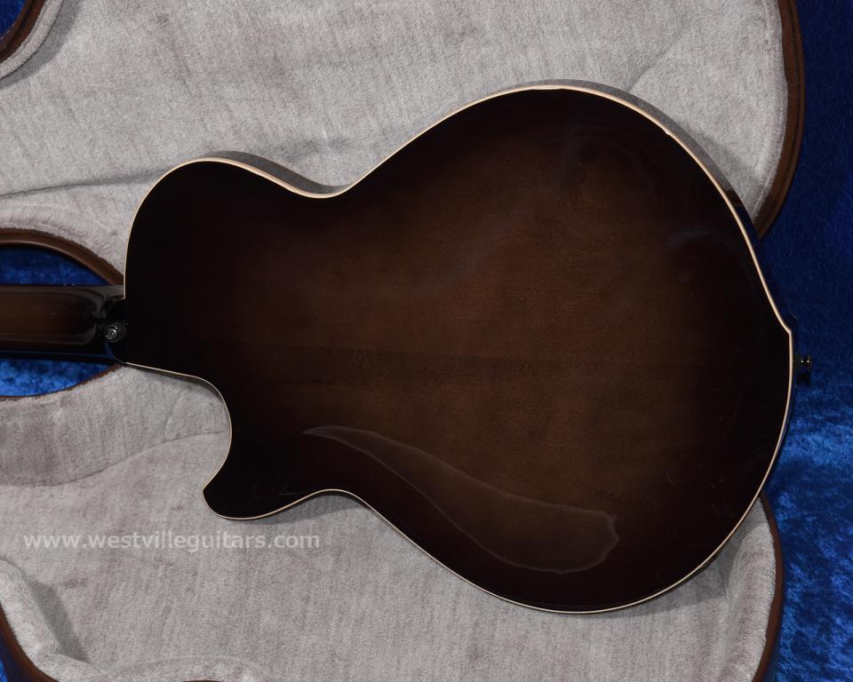 Its unique design and construction also features a solid carved (routed) “Hard Maple” side rim. This innovative and sophisticated design of the solid carved sides (side rim routed from 1 3/4″ thick “Hard Maple” plate) is complemented and enhanced by the structurally supportive and rigid “end block” on which the tailpiece of the guitar is mounted. The gorgeous Westville figured maple and brass hybrid tailpiece is directly attached to the end block of the guitar with a hard maple spacer providing the perfect balance between tension and resonance of the instrument.