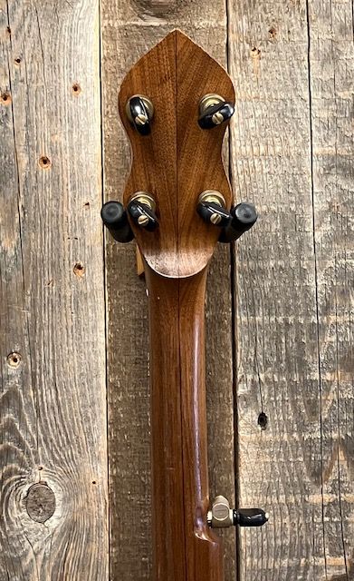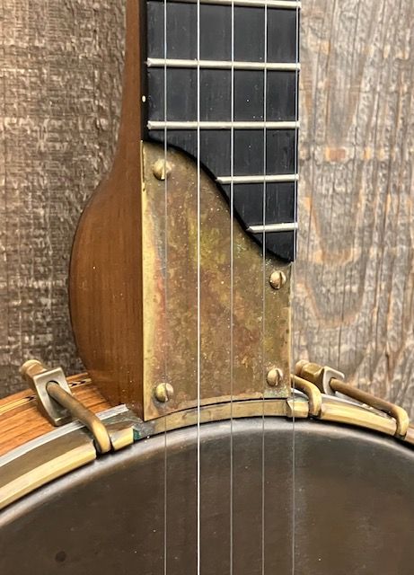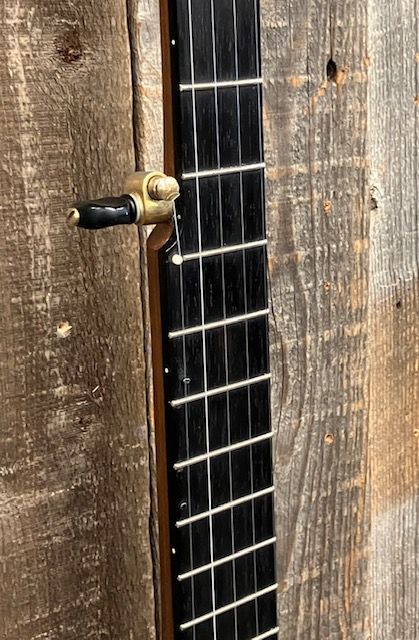 本器はショートスケール/12インチポット(チェリーブロックリム&ローズウッドトーンリング)仕様のカスタムメイドの1本のようで、ヘッドプレートや指板スクープ部分には