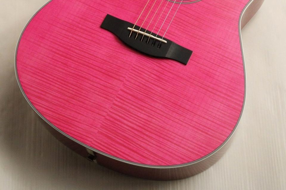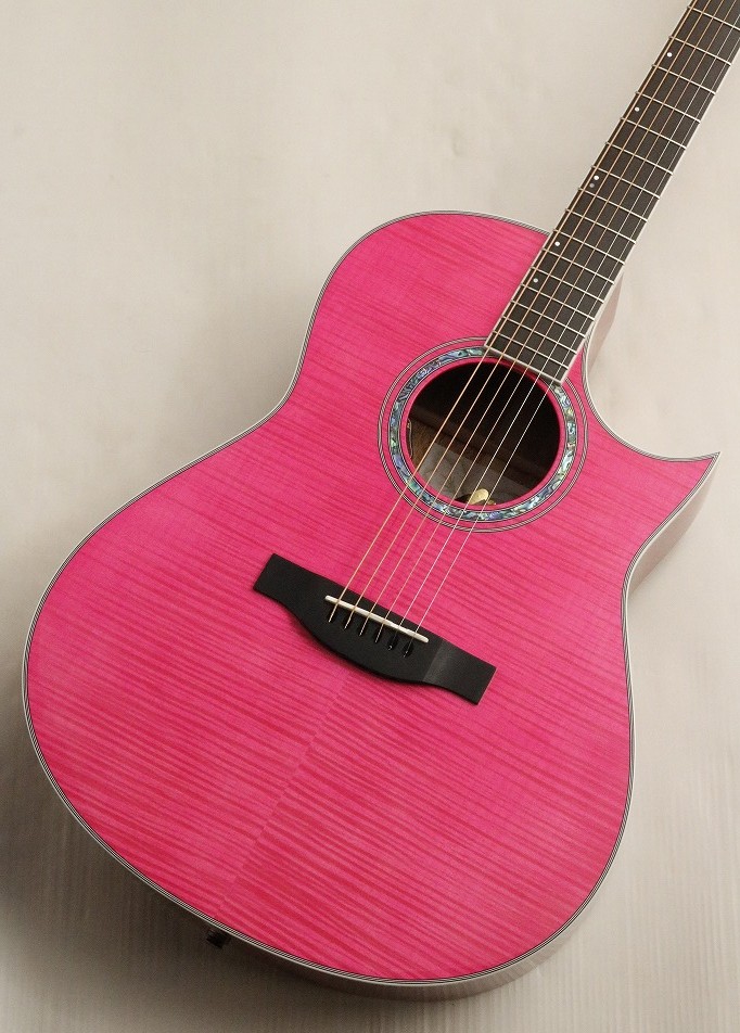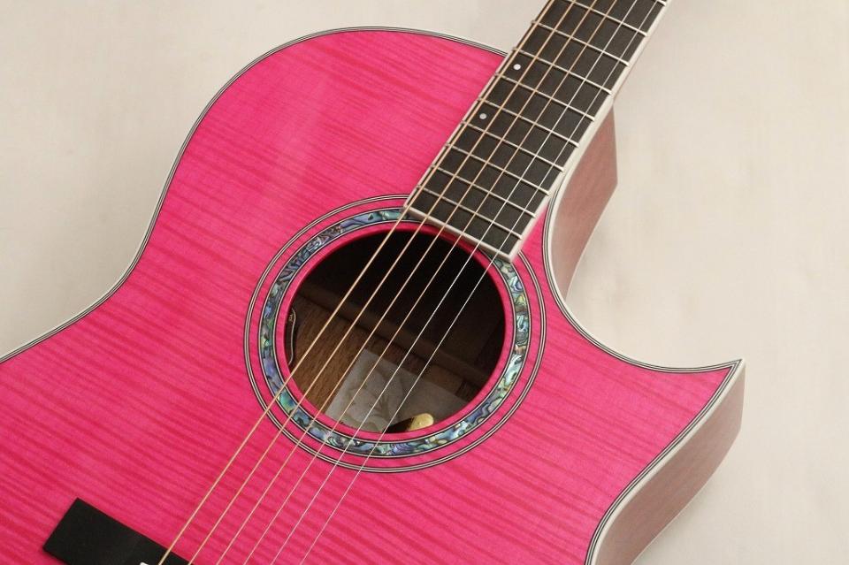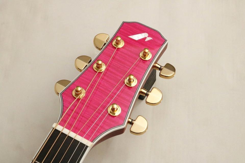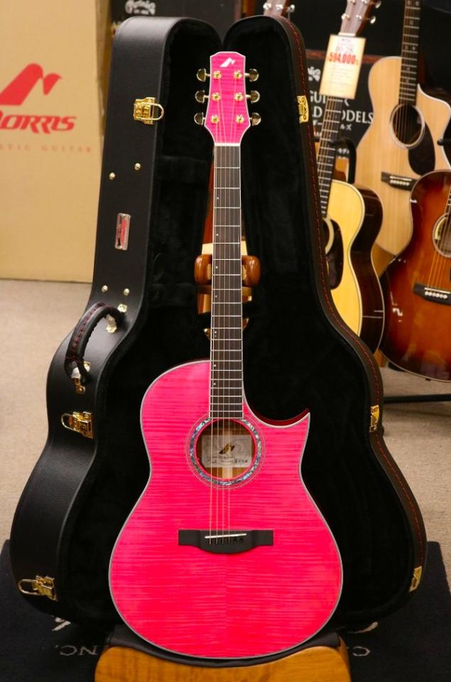 Morris ハンドメイドプレミアムシリーズのカラーモデル人気のシースルーピンクモデル。トップ材にはイングルマンスプルースに杢目の美しいフレームシカモアを化粧板として合わせて作製をしています。カラーモデル、杢目を強調したモデルとしては非常に優れたサウンドを持っており、エレアコ・カッタウェイモデルながら生音も魅力的なモデルです。カラーと併せて特徴的なフローレンカッタウェイは指板最終フレットよりも高い位置まで深くカーブを描いておりよりハイポジションへのアプローチがしやすく、ボディ厚が薄めで抱えやすく演奏性に長けたThinクラシカルオーディトリアムボディ。立ち上がり良く大きな響きが出やすいマホガニーの特性と652mmの長めの弦長から来るハリのある響きが混ざりクリアで素早い立ち上がりと軽いタッチで大きく響いてくれる迫力のあるサウンドになっています。反面強くピッキングをした時は少し割れたような荒っぽい響きになり、ピッキングの強弱でサウンドキャラクターが変わっていく気持ちよさと魅力があります。さらに長めの弦長の為ダウンチューニングや変則チューニングでも十分なテンションを確保することが出来、アコースティックギターの重厚でふくよかな低音を更に楽しむことが出来ます。サウンドホールにはアバロン貝、ヘッドロゴと指板ポジションマークにはマザーオブパールが採用されており美しいフレームシカモアとシースルーブルーの外観の魅力を更に引き立てています。ここまで魅力的なギターをこの価格で手に入れることが出来るのは伝統の国産ギターMorrisだからこそと言えます。ギター上級者のみならず初心者の方でも長く、幅広く弾く最初一本として是非ご検討いただきたいモデルです。是非この機会お手に取って見てください。