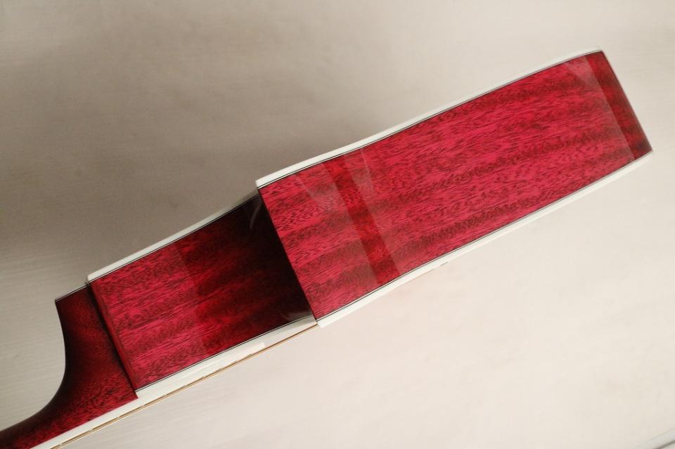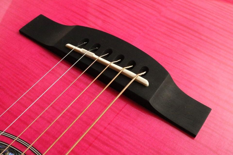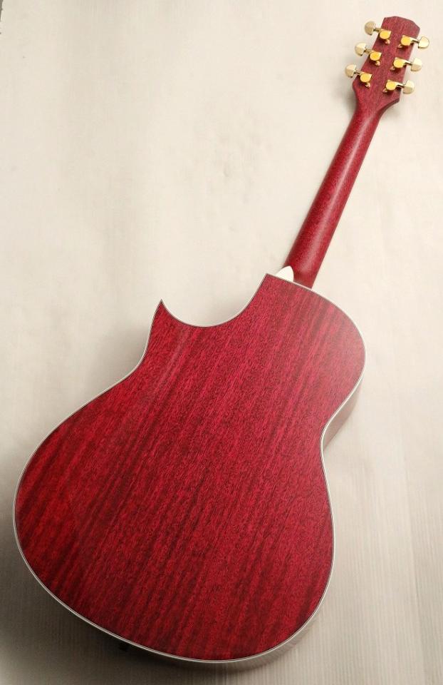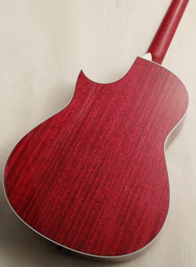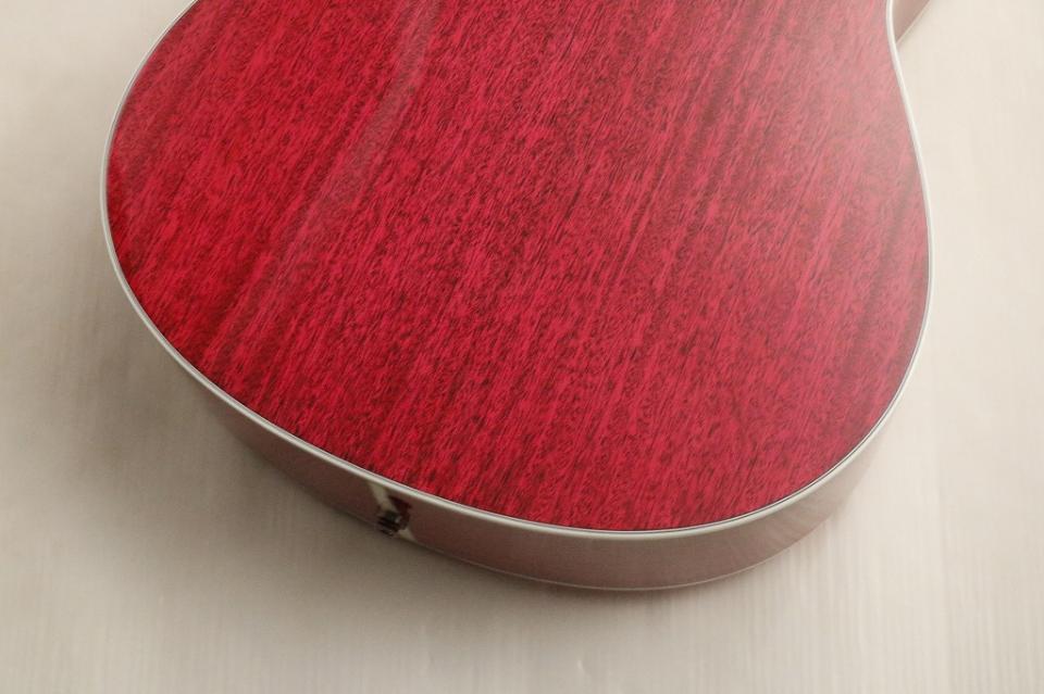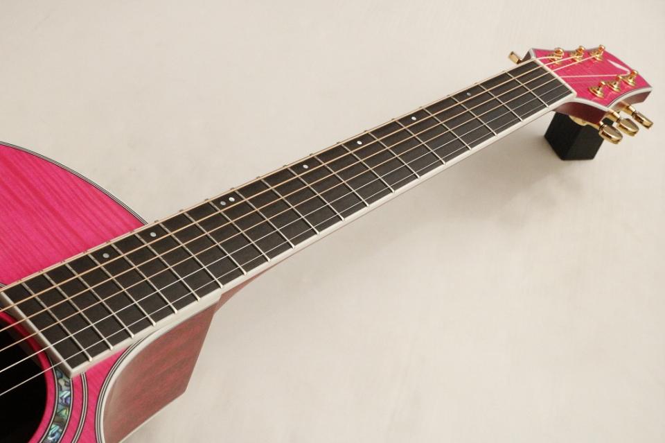 Morris ハンドメイドプレミアムシリーズのカラーモデル人気のシースルーピンクモデル。トップ材にはイングルマンスプルースに杢目の美しいフレームシカモアを化粧板として合わせて作製をしています。カラーモデル、杢目を強調したモデルとしては非常に優れたサウンドを持っており、エレアコ・カッタウェイモデルながら生音も魅力的なモデルです。カラーと併せて特徴的なフローレンカッタウェイは指板最終フレットよりも高い位置まで深くカーブを描いておりよりハイポジションへのアプローチがしやすく、ボディ厚が薄めで抱えやすく演奏性に長けたThinクラシカルオーディトリアムボディ。立ち上がり良く大きな響きが出やすいマホガニーの特性と652mmの長めの弦長から来るハリのある響きが混ざりクリアで素早い立ち上がりと軽いタッチで大きく響いてくれる迫力のあるサウンドになっています。反面強くピッキングをした時は少し割れたような荒っぽい響きになり、ピッキングの強弱でサウンドキャラクターが変わっていく気持ちよさと魅力があります。さらに長めの弦長の為ダウンチューニングや変則チューニングでも十分なテンションを確保することが出来、アコースティックギターの重厚でふくよかな低音を更に楽しむことが出来ます。サウンドホールにはアバロン貝、ヘッドロゴと指板ポジションマークにはマザーオブパールが採用されており美しいフレームシカモアとシースルーブルーの外観の魅力を更に引き立てています。ここまで魅力的なギターをこの価格で手に入れることが出来るのは伝統の国産ギターMorrisだからこそと言えます。ギター上級者のみならず初心者の方でも長く、幅広く弾く最初一本として是非ご検討いただきたいモデルです。是非この機会お手に取って見てください。