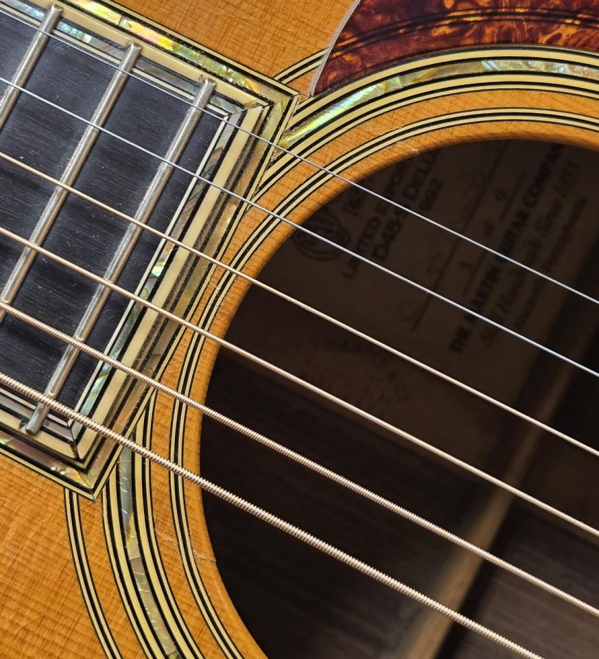 さらに、限定モデルらしく内部には 特別ラベルが貼られ、製作順を示すナンバーとともに、その希少性を物語っています。1992年製の中でもわずか数本しか存在しない“D-45S DELUXE”の中の 3 番目という点は、コレクターにとって非常に大きな価値を持つ要素です。