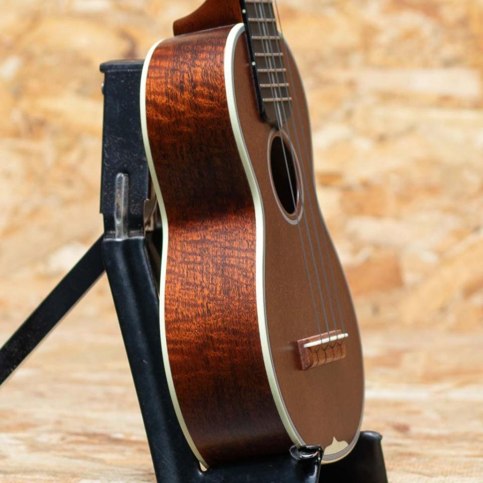 JAPANESEカスタムショップ製"Style-3"ソプラノウクレレ。ウエービーな美しい杢の入ったシンカーマホガニーを使用した一本。