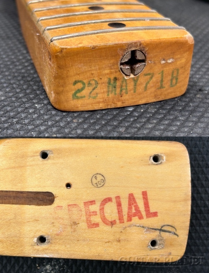 1971年5月製造のレフトハンド用、1ピース・メイプルネックを装着。