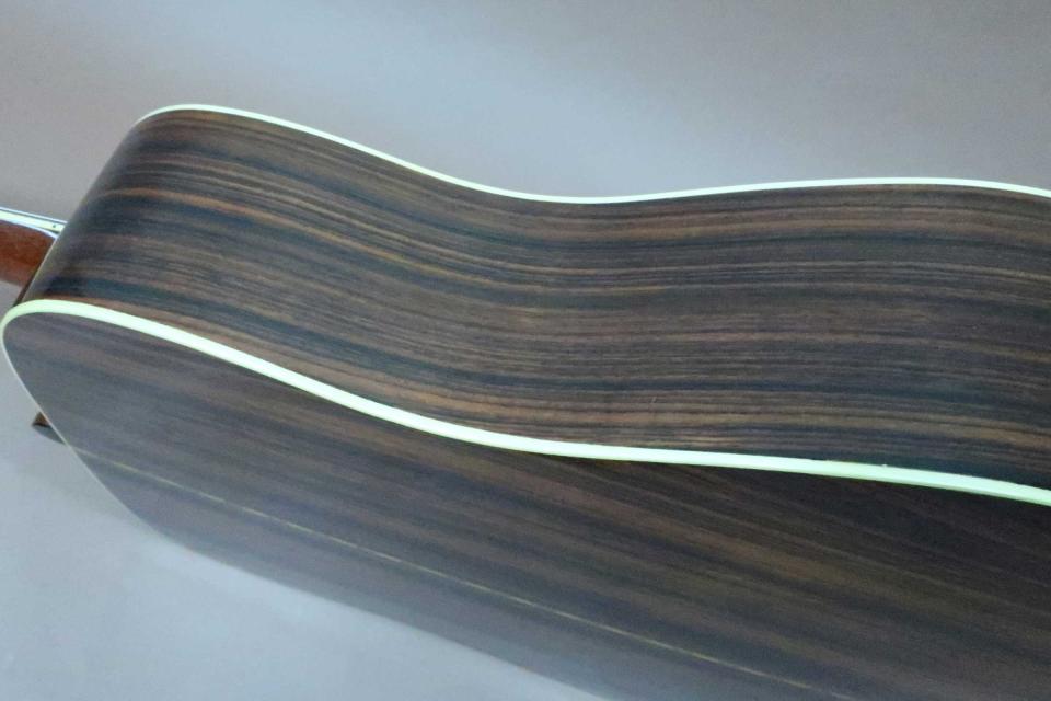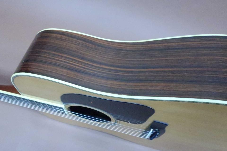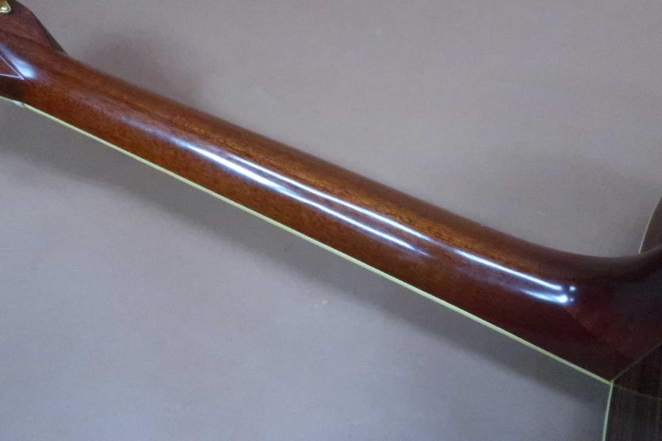 サウンドは箱鳴りする締まりと腰の有る低域に音抜けの良い輪郭の際立った中域に、シャリーンと響く高音域は煌びやかで艶があり倍音も豊かで当時のサウンド・クォリティーの高さが実感できます。当時はブルーグラス系の硬質で煌びやかな鳴りが好まれ、高級モデルには更にハカランダ材が使用されたりと豊富な製作材に恵まれた時期でも有りました。