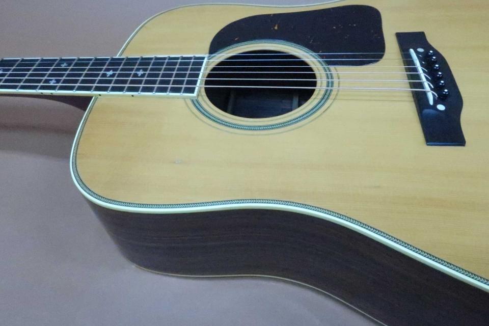 状態はペグがゴトー製ゴールドペグに交換されておりチューニング等は問題ありません。トップはピックガード下にスクラッチ傷と6弦左上にポツ打コンとボディ下部にポツ打コンが所々に見受けられますが酷く目立つダメージやクラックなどの木部の割れなどはありません。サイドやバックは綺麗で軽い擦り傷ぐらいで年代から考えれば綺麗なコンディ9ションを保っております。ネック裏も綺麗で気になる傷や打コンもなく。フレットも9分目ぐらいは残っており磨きを掛けて直ぐにご使用が可能です。またネックヒールのピン打ちやピックアップの取り付けも有りません。生産から40年以上経過したギターですので細かな見落としがあるかも知れませんが、ご理解を頂ければ幸いです。