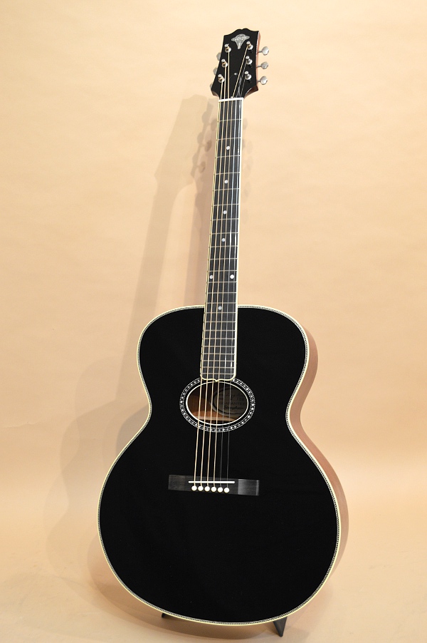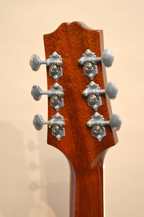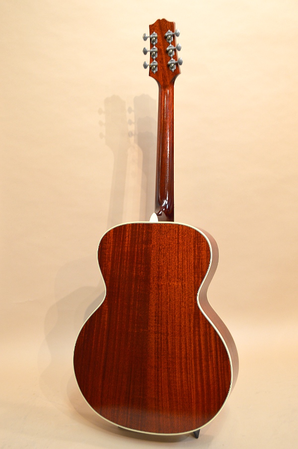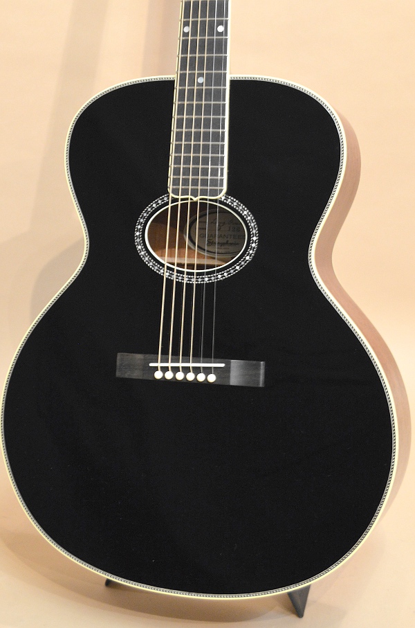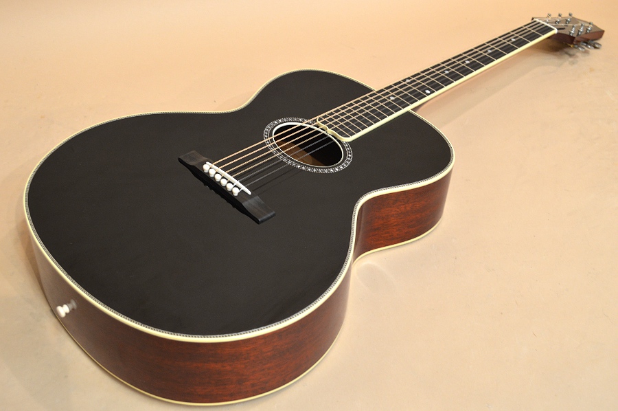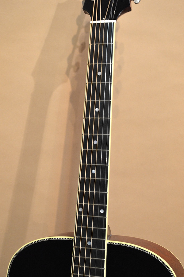 ソリッド・アディロンダック・スプルースTOP、ソリッド・マホガニーSIDE&BACK、マホガニーNECK、エボニー指板&ブリッジ、実測43.2mmナット、645mmスケールの16インチ・フラットトップ。1910年代~20年代に掛けてギブソンで作られていたアーチ・トップ・ギター、L-4をモチーフにしたフラットトップ・バージョンです。ロープ・バインディングやサウンドホールを取り巻くダイヤモンド・ロゼッタなどなど、好きな人には堪らない悩殺スペックとなっております!そしてもう一つ特筆すべきはこのギター、生アコの常識を覆す23フレット仕様なんです!まぁサウンドホールの位置と14フレット・ジョイント等の兼ね合いでデザイン的なバランスでこうなった訳で、なかなか全てのフレットを使う人も居ないでしょうが、、、ノン・カッタウェイをものともせずにガシガシハイフレットを弾ける猛者には頼もしいスペックかと思います(笑)!