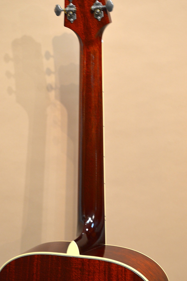 サウンドはちょっとビックリのラウド且つ深みのあるサウンドです!13.5インチのLeRoyであれだけ鳴るんですから当然と言えば当然ですが、、バウンバウンと気持ちよく鳴ってくれます。特に5、6弦の出方が半端なく、太鼓のような腹にドーンと響くサウンドはクセになりますね。ドーンと胴を震わすローに極薄ラッカー・フィニッシュならではの反応の良いミドル、艶やかで透明感のあるハイなどが混然一体となり、ボリューム感たっぷりなサウンドを響かせます。SIDE&BACKはマホなので、ローズウッド・ボディーのような重たさや密度はありませんが、軽やかにバウンバウン鳴ってくれる印象です。決して上品なサウンドではありませんが、フラットピックでもフィンガーでも想像以上にボリューミーで反応の良いサウンドをご堪能頂けます!