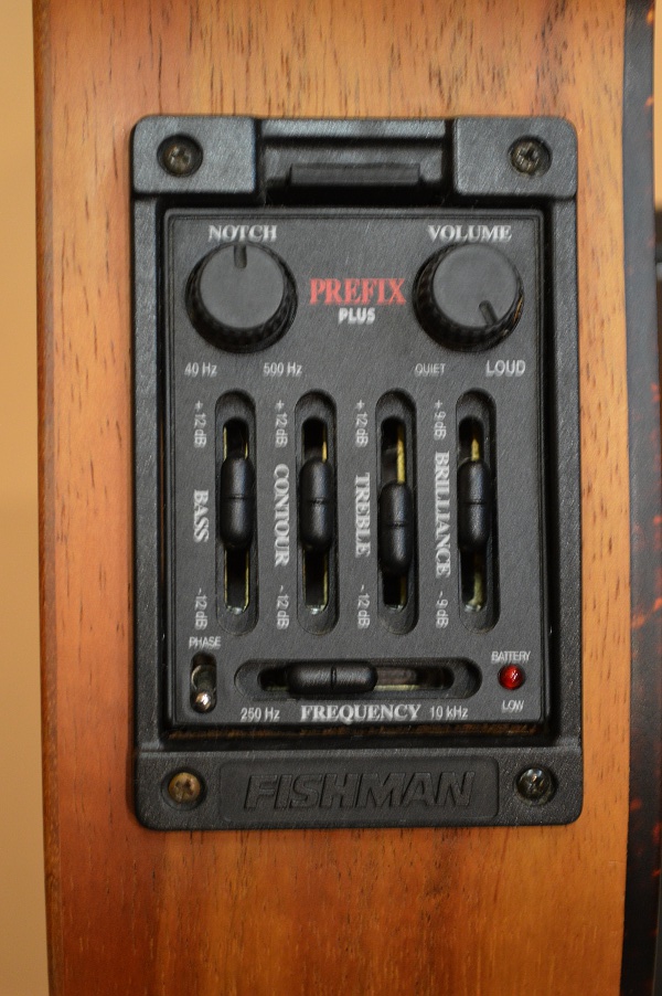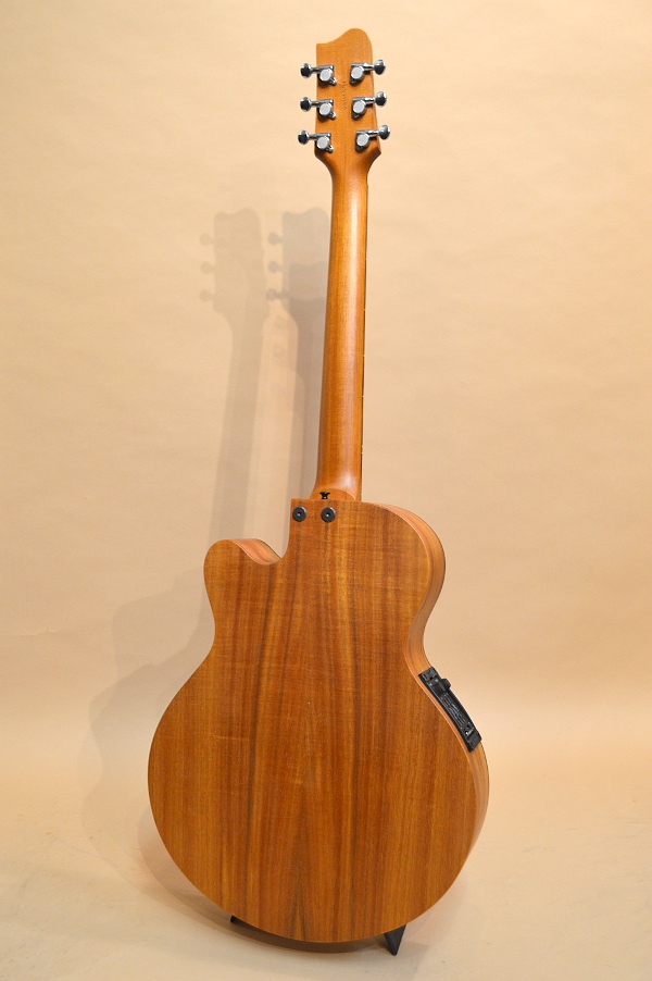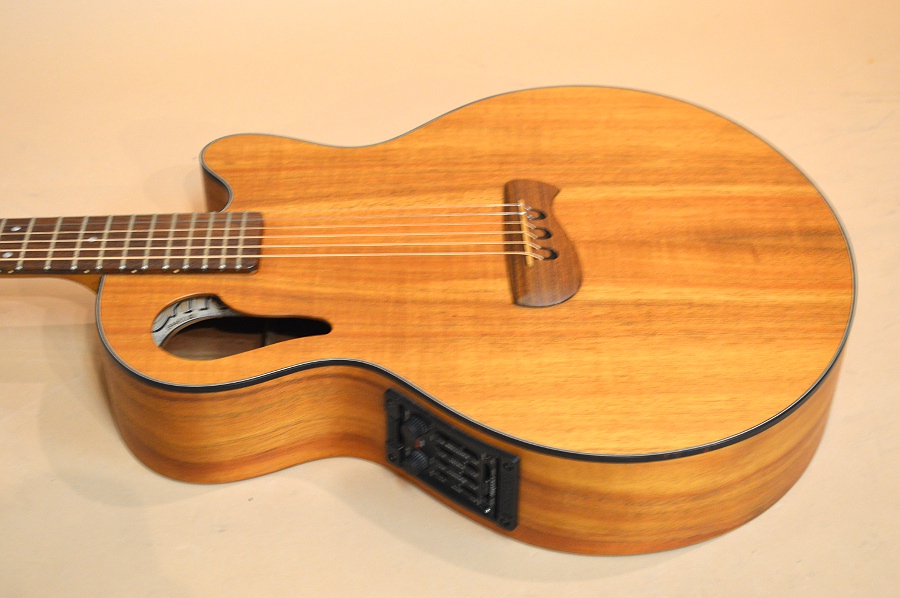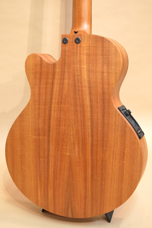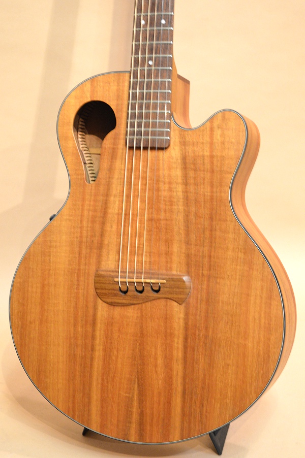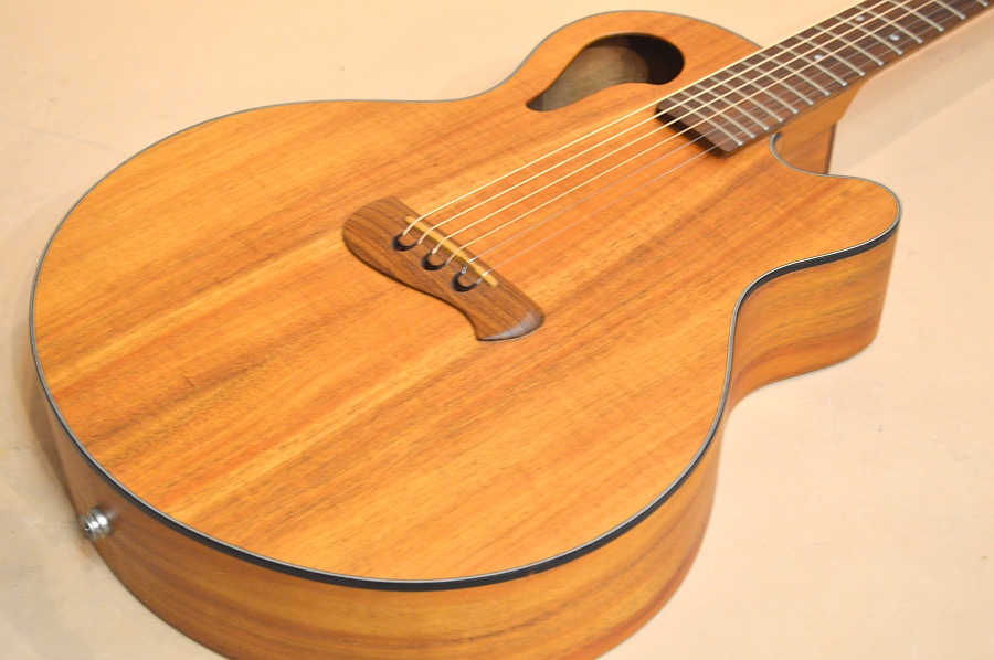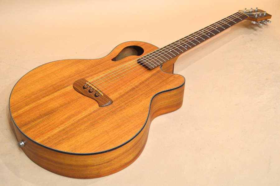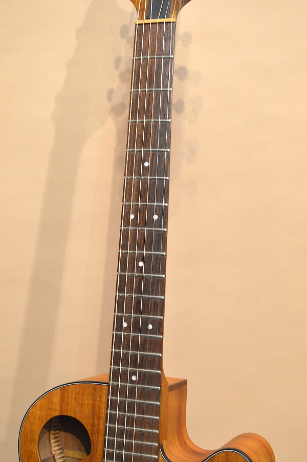 ソリッド・コアTOP、ソリッド・コアSIDE&BACK、マホガニーNECK、ローズウッド指板&ブリッジ、Fishman Prefix Plusプリアンプ、実測44.5mmナット、25.5インチ・スケールの15.25インチ・ボディー。ボディー幅は約387mmとマーチンで言うところの000サイズよりも僅かにワイドなボディーですが、ボディー厚は9cm弱と薄胴なので、抱えた感じは000か、それよりもコンパクトな感じがします。ネック幅は44.5mmとワイドですが、ネック厚は薄めで、弾き心地はかなり細く感じられ、プレイヤビリティーはバツグンです。