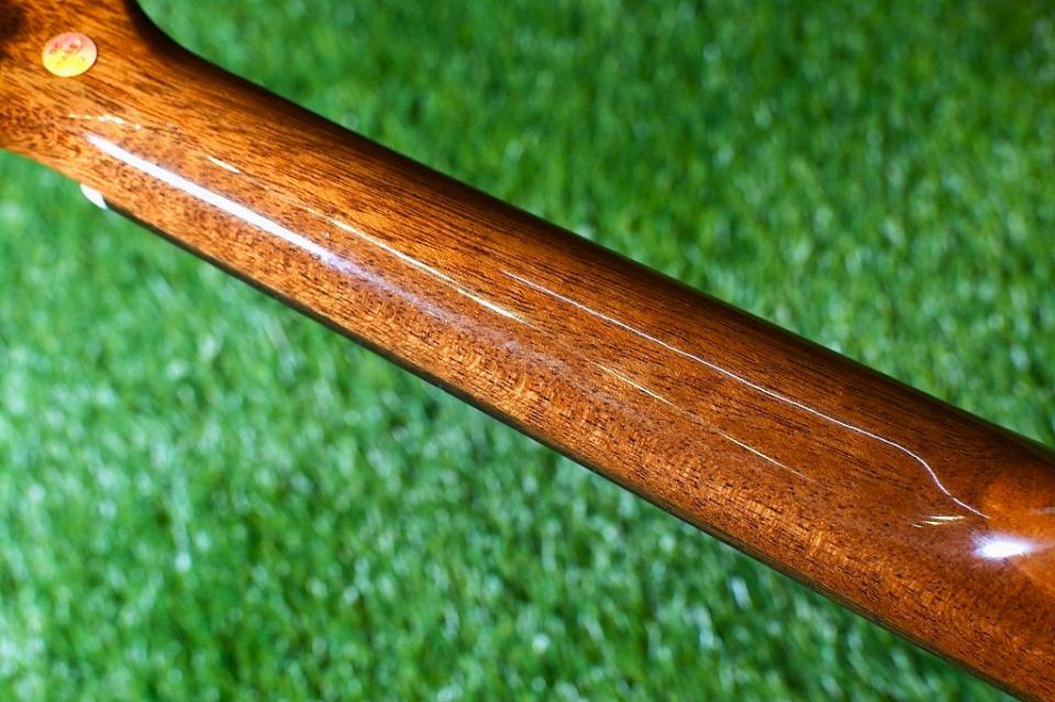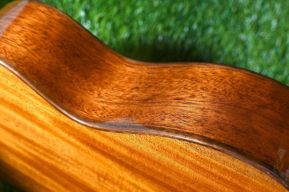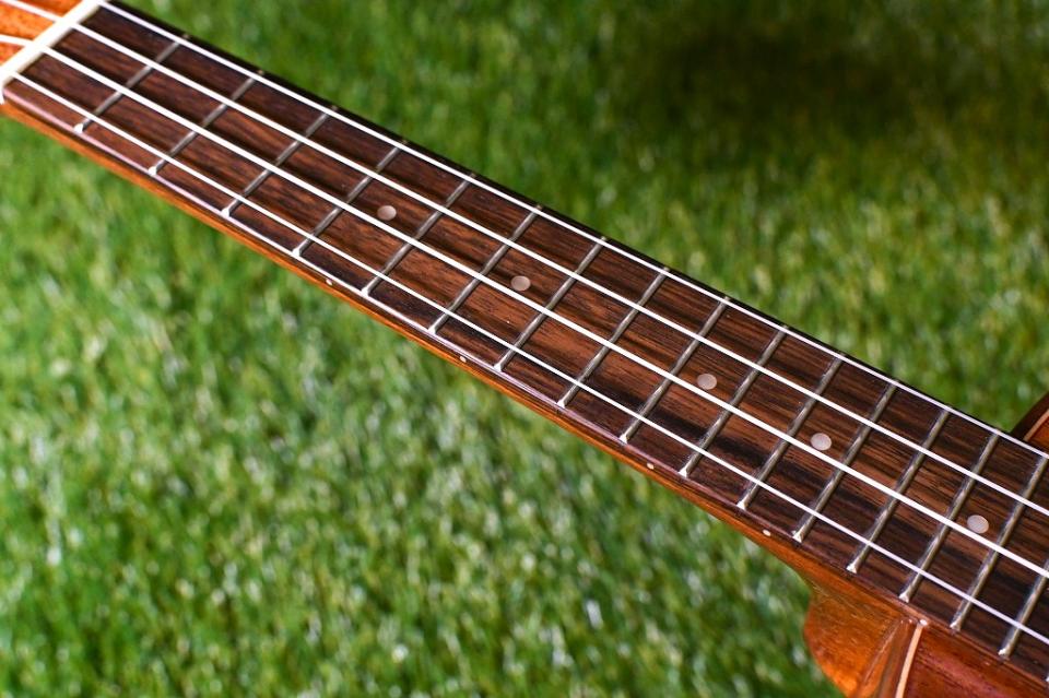 トップ・バックに単板を使うことで鳴りを良くし、カリン材を織り交ぜたロゼッタやバインディングが綺麗なモデルです。