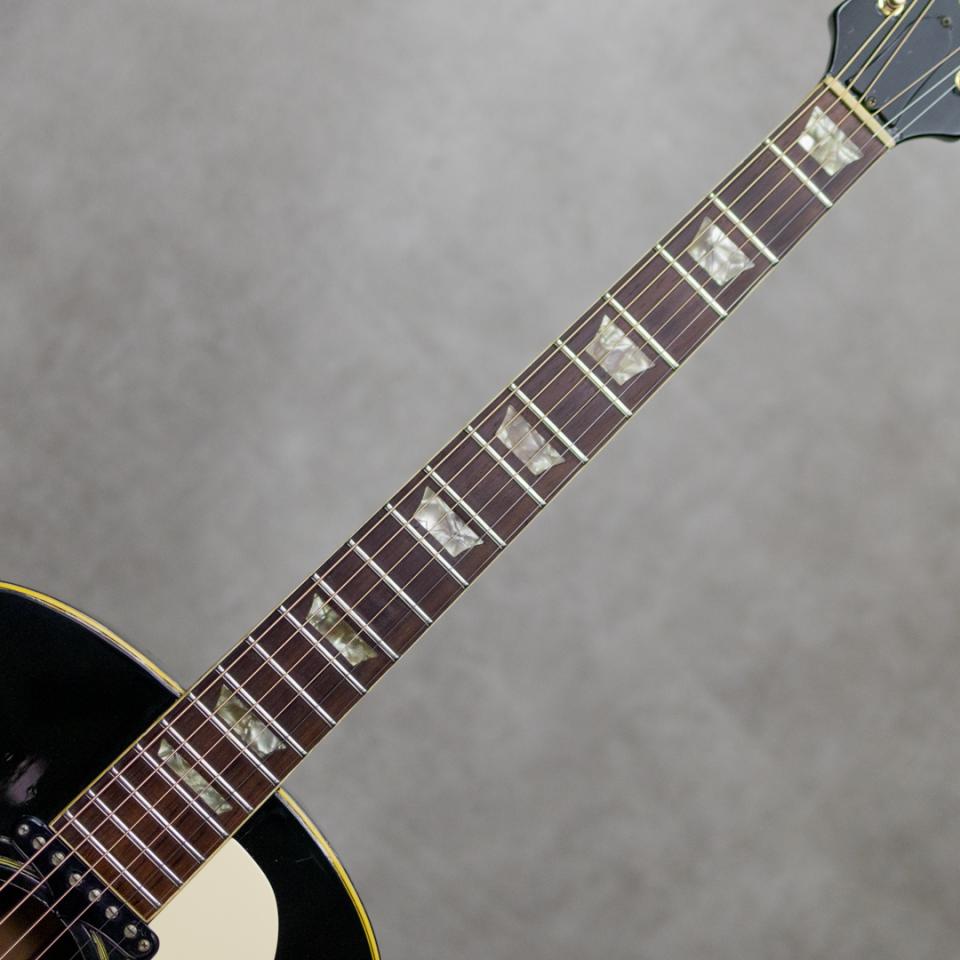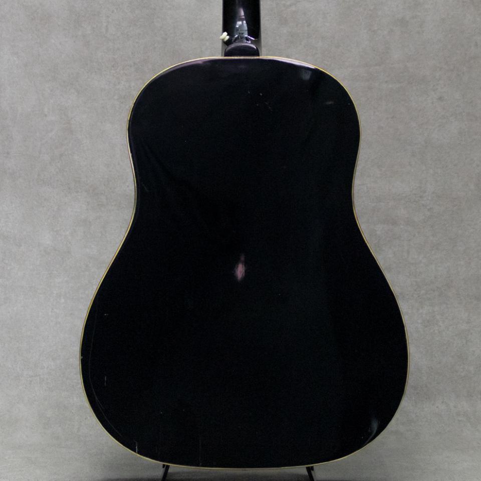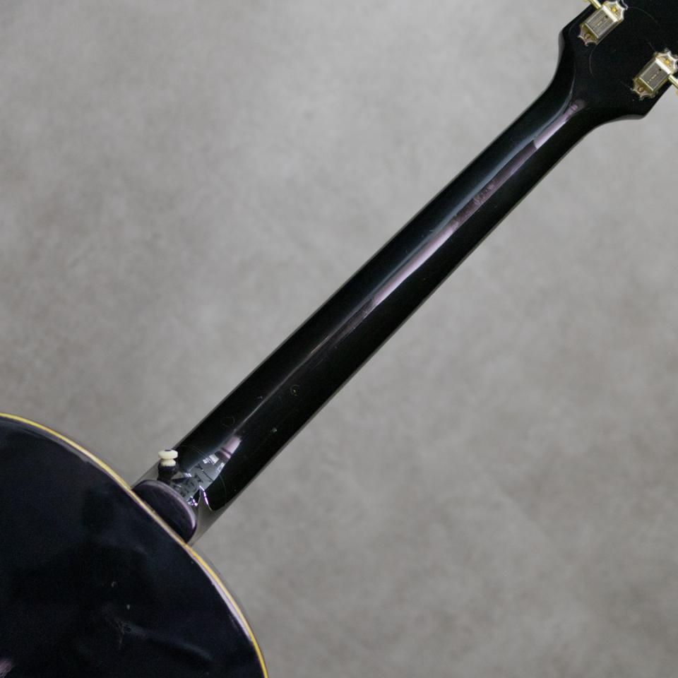 ブックマークする 値下げ通知に登録ジョン・レノンとジョージ・ハリスンがお揃いで入手したギター、ビートルズギアとしてあまりにも有名な機種である"J-160E"。1951年にアンサンブルの中でも音量で負けない様にと発表された世界で始めてピックアップが搭載されたフラットトップ"CF-100"。その基本コンセプトを受け継いだ"J-160E"は1954年に発表されました。本器は、1968年製 Vintage品。オリジナルビンテージを惜しげも無くブラックカラーにリフィニッシュした本気カスタムの1本。スプルーストップ、マホガニーサイド&バック、マホガニーネック、ローズウッド指板&ダウンベリーブリッジ、"クルーソンデラックス"リプレイスメントペグ、クラウンヘッドロゴインレイ、ディッシュパーロイド指板インレイ、セルロイドバインディング、15フレットジョイント、ワンボリュームワントーンのP-90、ナット幅約39.5mm。この年のピックガード形状をもとに作成されたホワイトカラーのポインテッドラージガード、可能な限りオリジナルの雰囲気を残しながら吹き足されたブラックカラーフィニッシュ。ラダーブレイスのこの年代ならではのジャリンとしたサウンド、独特の存在感を放つクールなルックス、そして味わいのあるラインサウンド。過去に後付けで別のピックアップ搭載履歴があり、エンドジャックが12mmに加工されています。オリジナルのP-90はボディサイドのジャックからアウトされます。若干の小傷はが見られますが、全体的に美しいコンディションを保たれた本器。ネックコンディションも良好で弾きやすいアクションを保っています。6弦側サイドにストラップピンの取付埋め跡があり、現在はネックヒールにストラップピンが増設されています。まさにあのシグネイチャーモデルのリアル版の本器。ステージ映えもひとしおな1本、是非要チェックください。ソフトケース付属。