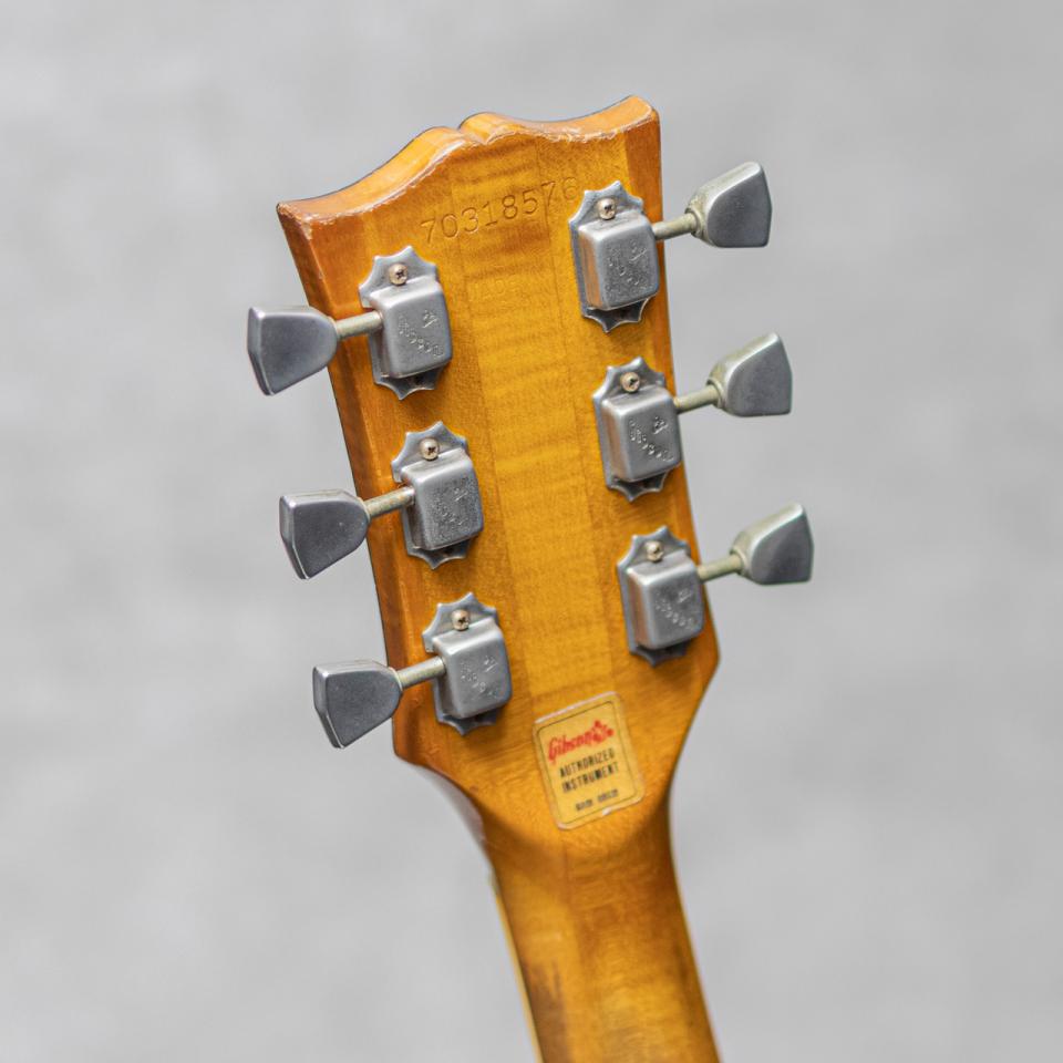 生産拠点を元のカラマズー工場から、現在のナッシュビル工場へと移転し始めた1970年代、所謂"ノーリン期"の"Les Paul Standard"。1970年代前半に販売がされたのはミニハムバッカー搭載の"Les Paul Deluxe"でしたが、1974~75年頃には本格的にフルサイズハムバッカーが再び採用されるようになり、モデル名も"Les Paul Standard"へと回帰していきます。その後1990年代に登場するCustom Shop製リイシューとも並行して作り続けられてゆくレギュラーラインの"ナッシュビル製Les Paul Stadnard"、その系譜の最初期ともいえる時期です。本器は1978年製"Les Paul Standard"、この時期には少し珍しいGold Top。ラージヘッド、14度の浅いヘッド角、3ピースメイプルネック、メイプルトップに1ピースマホガニーバックのボディ。この年式特有のマテリアルと構造はサウンドにも大きく影響しており、重厚な造りによるタイトで直線的な音の飛び方と安定感のある出力、シンプルな挙動の出音はエフェクトの乗りも良くパワフルなハイゲインサウンドにも抜群の相性です。またこの頃のGibsonではボリューム、トーンのポットに300KΩの抵抗値を採用しており、高音域が少し抑えられることにより独特にハイミッドが強調されたトーンも特徴的。歯切れの良さとGibsonらしい音像の甘さ、Les Paulらしいパワー感とが絶妙にミックスされた特有の魅力。雰囲気溢れる空気感で、クリーン~クランチでの存在感あるカッティングフレーズや、深く歪ませても音の分離感をしっかり残したドライブサウンドなど、非常に魅力的で"使える"サウンドキャラクターを持ちます。こちら全体的に打痕や弾き傷は経年相応にございますが、演奏性を損ねるものはございません。ネック裏、ボディエッジ、ボディサイド等塗装剥がれが見られる部分もありますが、目立った軟化等は無く雰囲気を損ねておりません。リフレット、リナット済みで演奏性も良好。ロッドの調整も問題なくネックも良いコンディションを保っています。"刻印ナンバード"ピックアップ、ポット、コンデンサ等電装系もオリジナルをキープ。年代特有のキャラクターが近年評価の高まりを見せる"ノーリン期"の1本、ぜひご確認ください。オリジナルハードケースが付属。