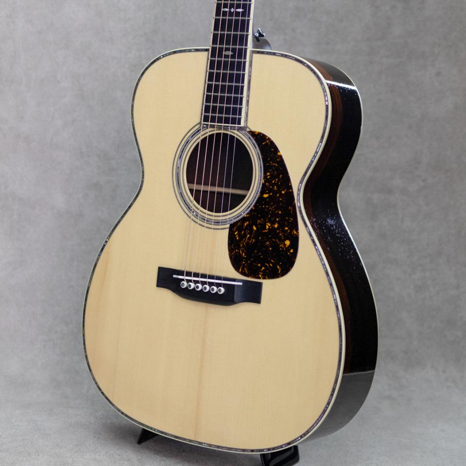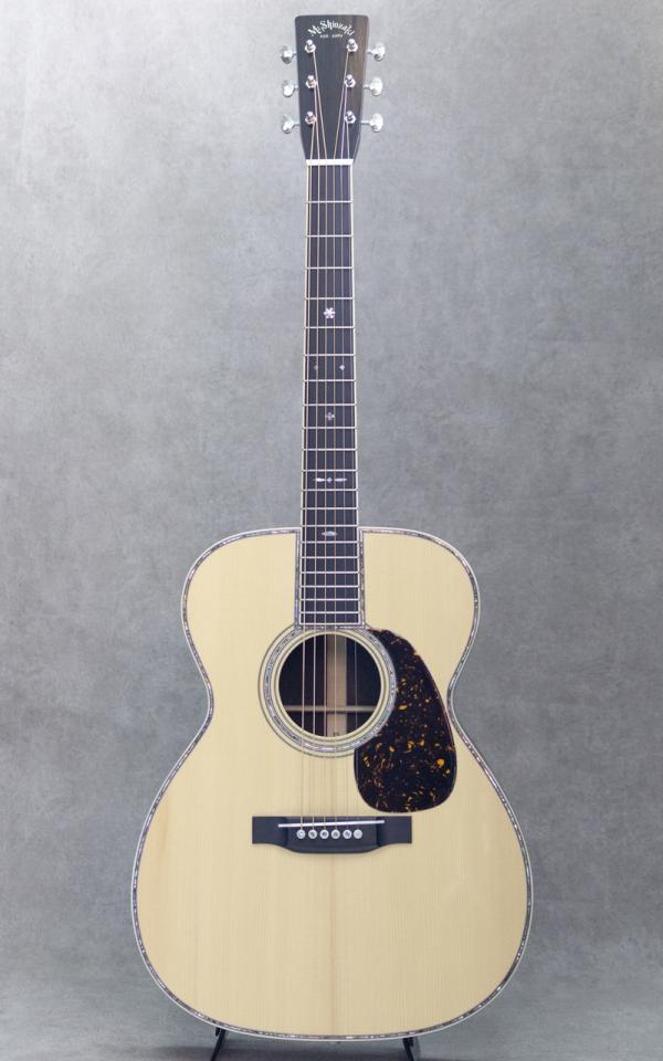 四国/愛媛はエム・シオザキ弦楽器工房の塩崎雅亮氏。日本におけるビンテージギター研究家・製作家の先駆け的存在とも呼べる巨匠ながら、今なおその研究熱心な姿勢に陰りを見せない進化する国内有数・ベテランルシアー。これまであらゆる年代の特徴を忠実に再現したMartin Guitarレプリカの製作や、自身の解釈や発展を大きく取り入れたオリジナルモデルの製作など多岐にわたえる作品を産み出しています。本器は、1939年製スタイル42にフォーカスした”OOO-5 Custom 1939 Jacaranda“。2024年製極上USED品。トップには真っ直ぐで美しい杢目のアディロンダックスプルース、サイド&バックには黒々とした美事なオウルドグロウスハカランダを使用。ホンジュラス・マホガニー・ネック、Tバーネックロッド、エボニー指板&ブリッジ、ロングサドル、Waverly14060ハイレシオペグ、ハカランダ天神板、ショートスノウフレイクス指板インレイ、塗り込みべっ甲柄セルロイドピックガード、メキシコ貝の42スタイル・ロゼッタ&トリム、アイボロイド・バインディング、モザイクバックストリップ、ニカワ接着。45とはことなる42ならではのゴージャスながらスウィートな響き。箱の中で折り重なる倍音は甘く重厚で、金属弦の音を包み込み硬質な印象を一切与えない至極のトーン。濃密ながらどもらず分離の良い響きは、オールドのそれをオーバーラップさせてくれます。このサウンドは塩崎氏が再現する”45”の倍音構成を持つサウンドボードならでは。ほとんど使用感を伺えない極上コンディションの本器。ネックまわりももちろんパーフェクトです。手にした瞬間にリアルビンテージと錯覚する質感は、ビンテージマーチンを知り尽くした塩崎氏ならではの業。当時の新品はきっとこんな感じだったんだろうなと確信させる至極の完成度です。ビンテージマーチンモデル製作のトップクラスを誇る塩崎氏の製作モデルは、近年ますますの円熟味を魅せる美事な完成度、、究極の42モデルを存分に味わっていただける1本です。この上ないスペックと高い当時再現度を誇る至高の1本。是非お手元に。オリジナルハードケース付属