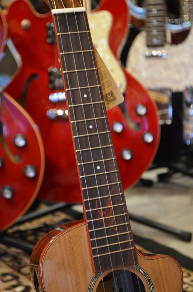 パドゥーク材のバインディングや指板上に描かれたバタフライのデザインが特徴的となっており、