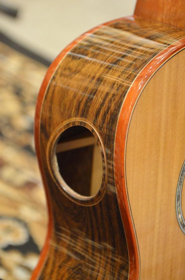 ボディトップにはシダー材を用い、サイド・バックにはエキゾチックな杢目が美しいコーディア材を使用した当モデル。