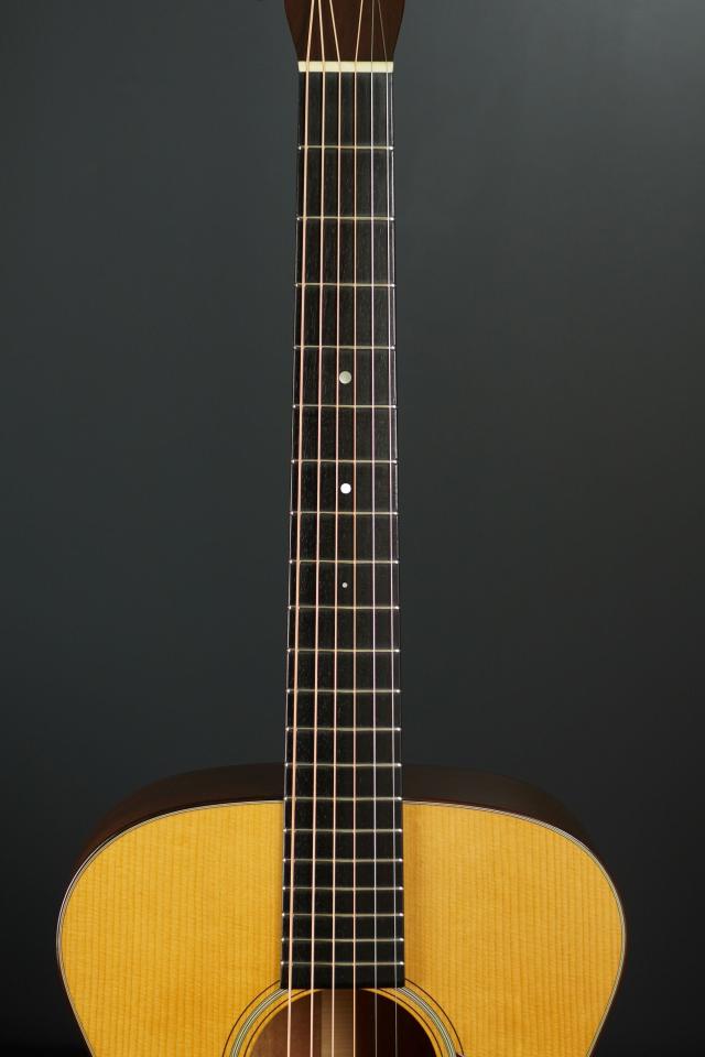 ボディのバインディングには贅沢にもブラジリアンローズウッドが使われており、スタイル18のシンプルなロゼッタに鼈甲柄のスモールピックガード、30年代と同じシェイプのエボニーブリッジにロングサドルの仕様で、ヴィンテージギター同様のルックスとなっております。