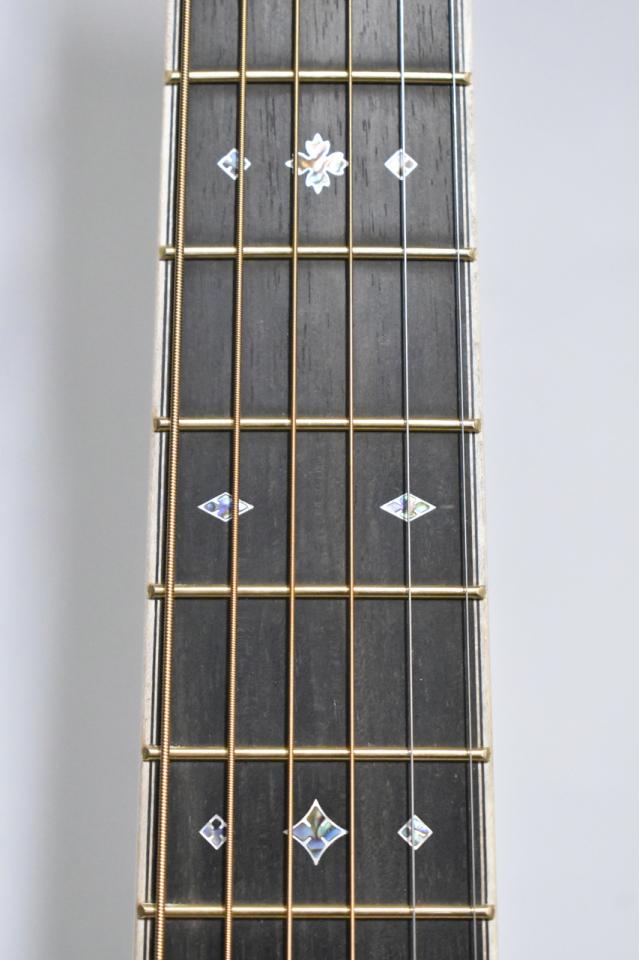 ヘッドストックにはパールで縁どりされた華やかなアヴァロンのトーチロゴ、指板にも同様にパールとアヴァロンでスノーフレイクインレイがあしらわれています。
