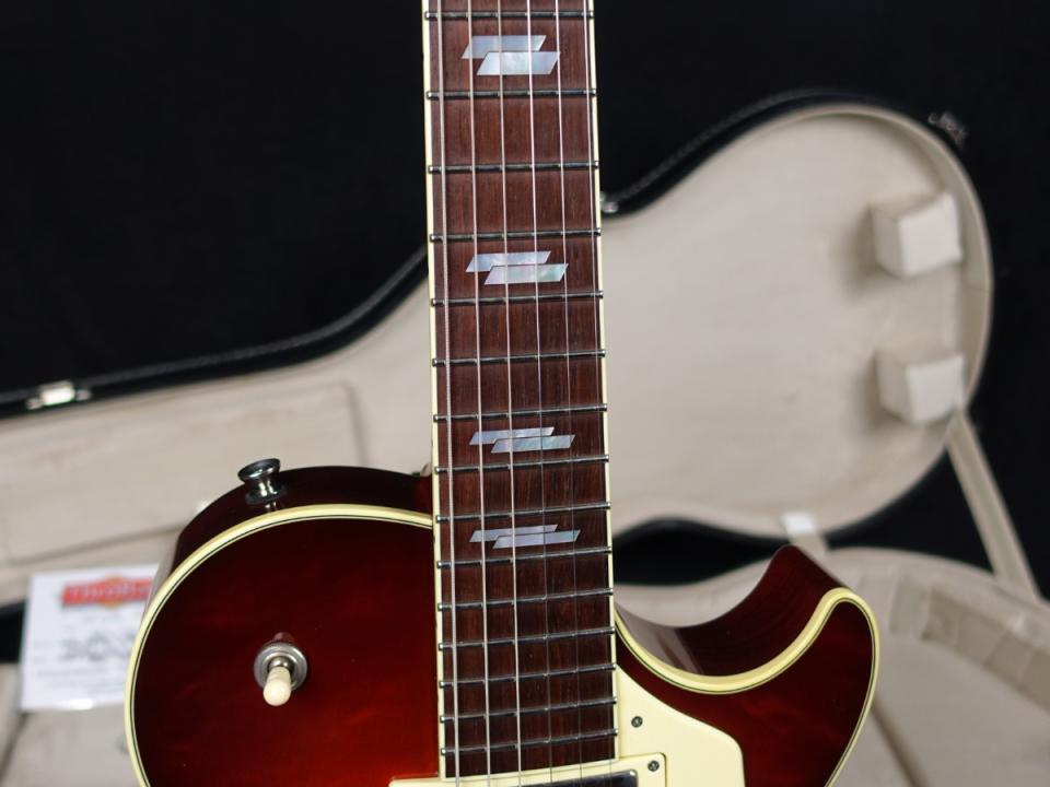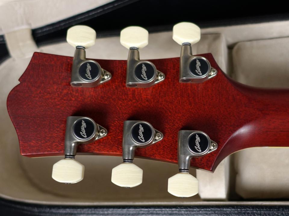 独自のパラレログラム・インレイ仕様、杢目のアイボロイドバインディング、ペグヘッド、カスタムメイドのアイボロイドトップハットノブ、トラスロッドカバーなど独自の特別な仕様が所狭しと散りばめられております。