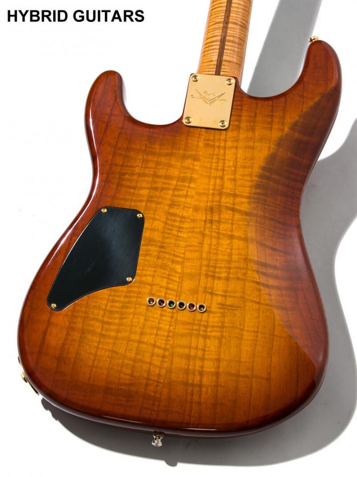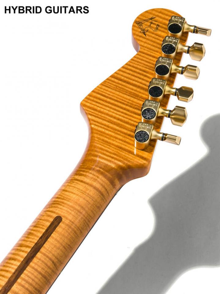 本機はボディにFlame Ash、指板にRosewood、ネックにFlame Mapleを使用し、指板ラディアスは7.25inch、フレットにJumboタイプを採用しています。ピックアップにはFender Custom Shopのブラックボビンタイプを搭載しています。ペグにはSperzelを搭載し、ノントレモロブリッジを採用しています。ハードウェアはゴールドでまとめられ、ピックアップのポールピースにもゴールドを採用しているのは限定品ならではです。