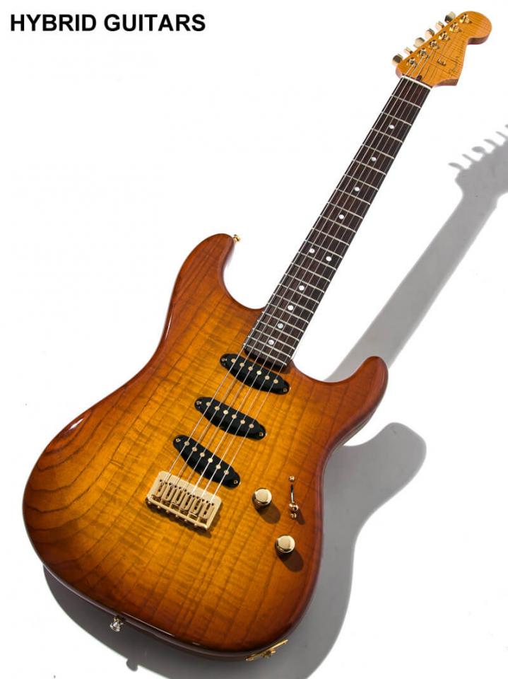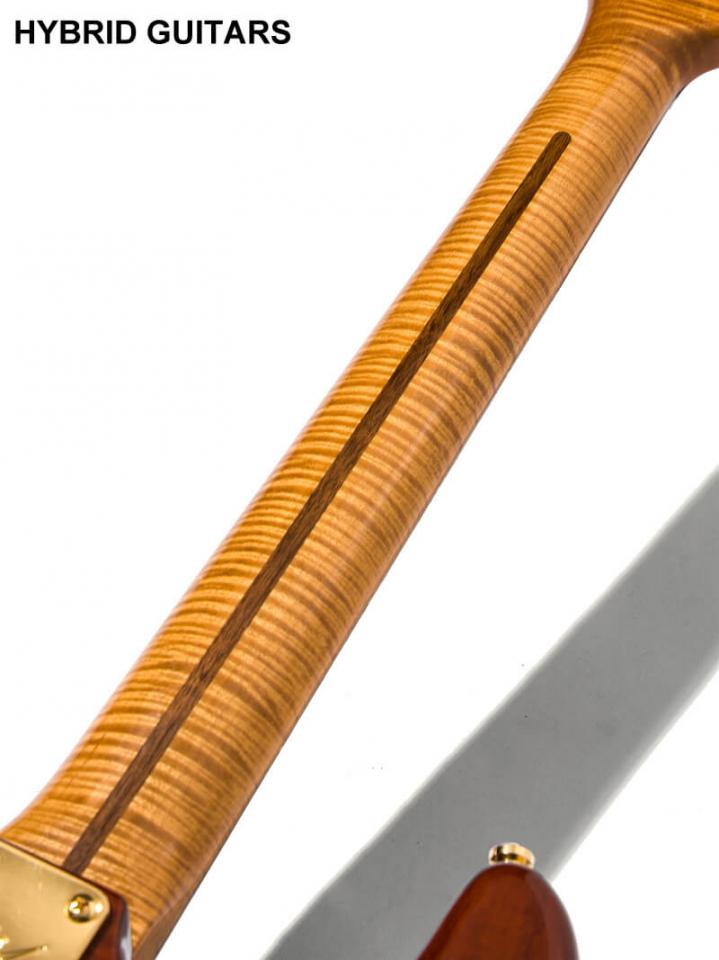 なかなかお目にかかれない無垢Flame AshボディとFlame Mapleネックを採用し、シニアマスタービルダーであるJohn Cruzが2007年に製作したFender Custom Shop MBS Flamed Stratocaster Cherry Sunburstです。ボディートップとバック材は張り合わされていなく、選定された1枚のFlame Ash材が使われており、無垢材ならではの深みのあるFlameです。