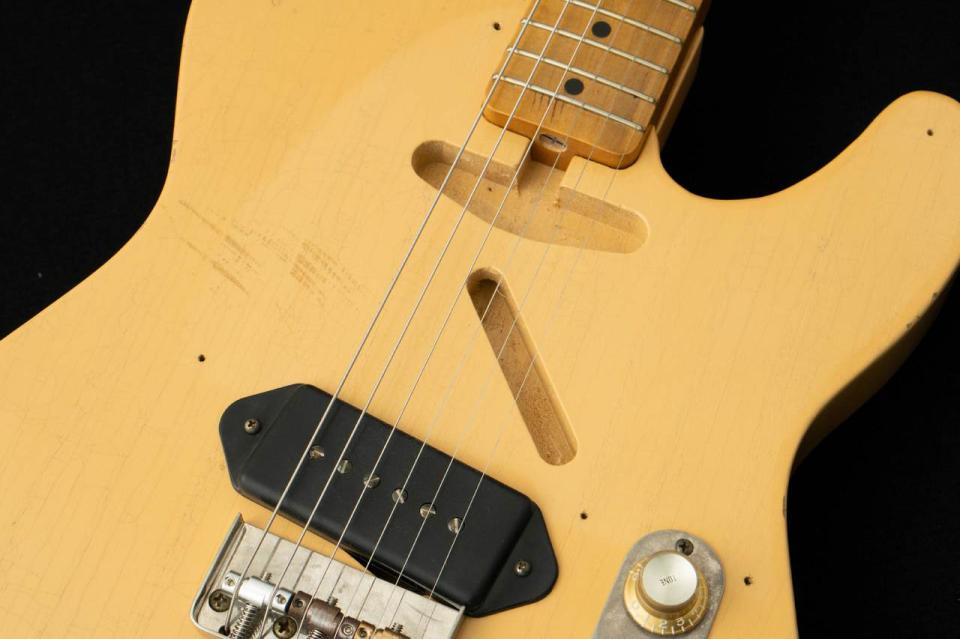 VolumeノブにはTONEの文字を記入、トーンはトグルSWにて固定のON/OFF、サドルは3つと違う材質、P-90 P.U.には絶妙なスラントをつけるなど独特な風格を漂うモデル。