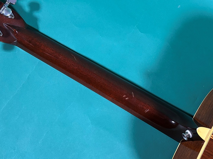 塗装状態はピカピカに綺麗ですが、渋く色焼けしていて飴色っぽい感じになっていています。雰囲気のある色合いの割にキズは少なく綺麗です。ネックバックに当てキズがいくつか見られます。