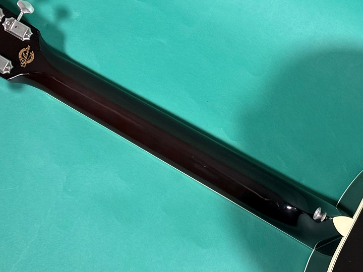 ナット幅は約43.8mm、スケールは約628mmで、握りやすい薄めのネックグリップ。ペグはニッケルのシールドバックタイプで、経年によるくすみはあるものの、動作はスムーズです。ネックヒール部にはストラップピンが追加されています。