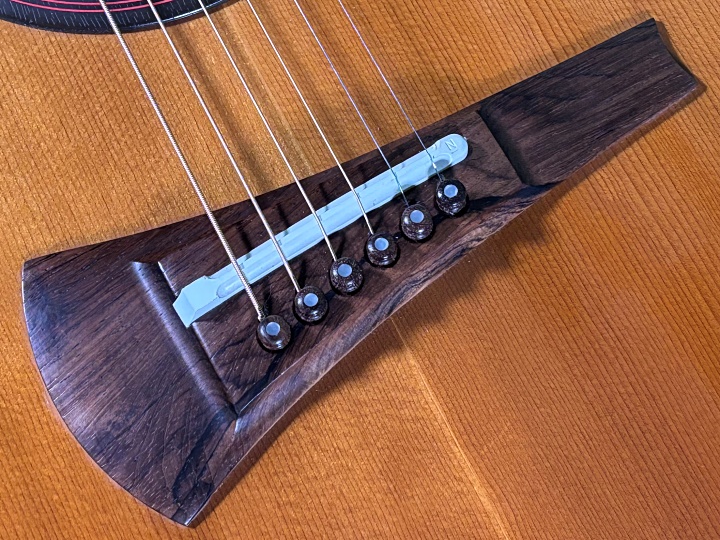 弦高は、12フレット上で、6弦2.4ミリ、1弦1.4ミリと、かなり低目で弾きやすくセットされています。ハイポジションまでスムーズでバランス良い演奏性だと思います。