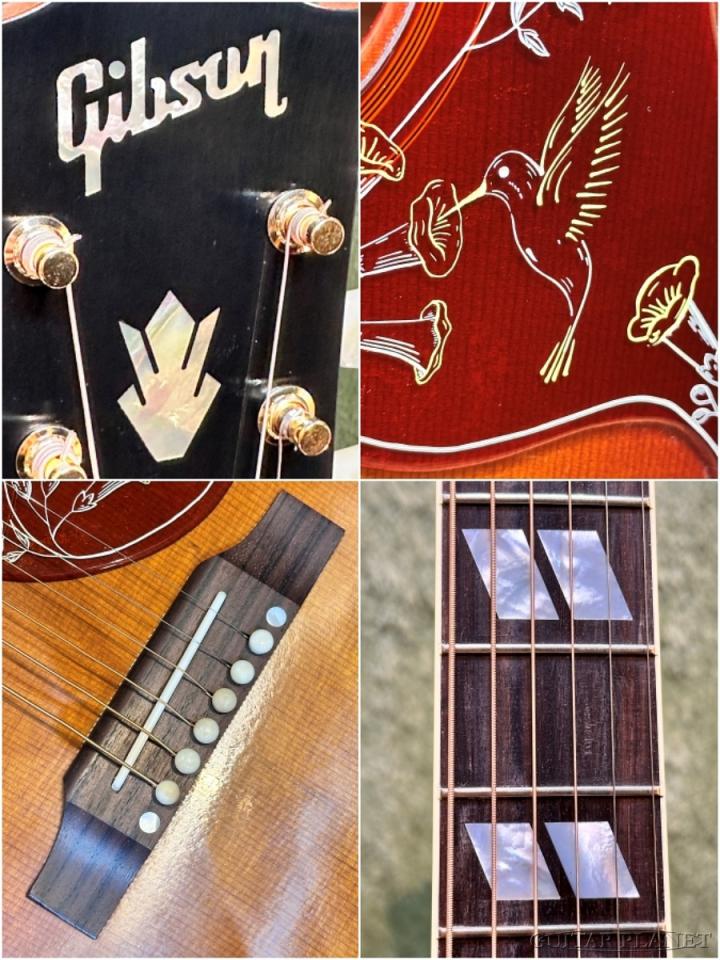 1960年にギブソン初の『スクエアショルダー』としてリリースされたハミングバード。トップは『シトカ・スプルース』、主にアラスカ産を使用。さらに特殊な熱処理により木材に炭素化する直前まで細胞レベルで変化を与える事で、長年使用されたヴィンテージ楽器と同様のサウンドが得られる『サーマリー・エイジド』加工が施されています。サイド&バックには純種の『ジェニュイン・マホガニー』中南米エリアの主にグァテマラン産を使用され、全体的に軽量な仕上がりです。ネック材も同様に『ジェニュイン・マホガニー』、指板&ブリッジには『インディアン・ローズウッド』を使用し、発売当初のマテリアルを限りなく再現。