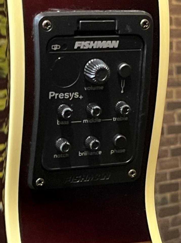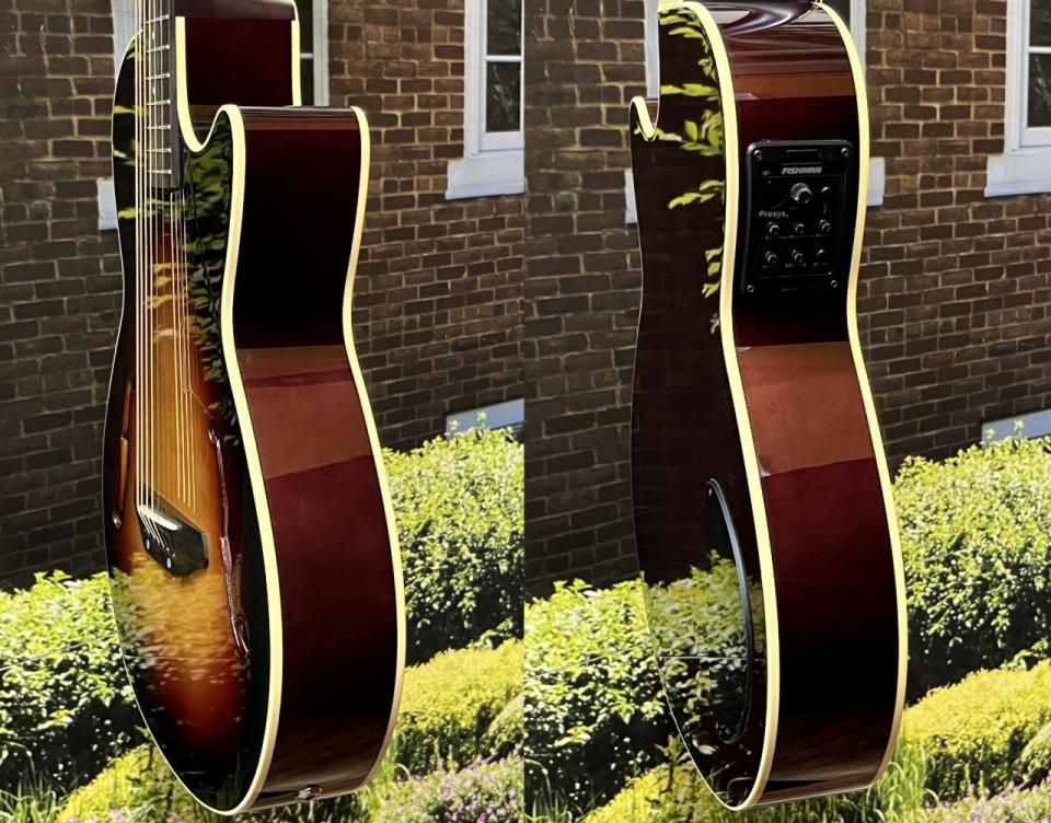 シングルカッタウエイ仕様、プリアンプにはFishman Presys+を搭載しておりますので、アンプに通してのライブ、ストリートでの使用に於いても充分に活躍出来るギターとなっております。