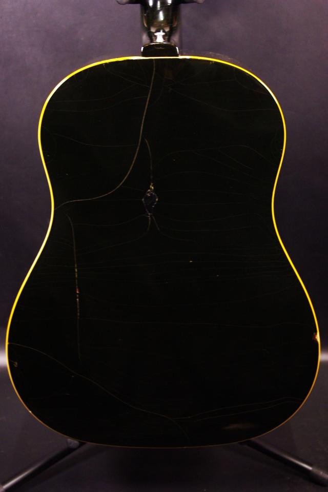1960年代後期に存在するレアカラー!貴重なブラックフィニシュのJ-45が入荷しました!!トップはスプルース、サイドバックにはマホガニー、指板とブリッジにはハカランダを採用、シリアルナンバーから1968年が有力でベリーブリッジなのが特徴です。クルーソン3連ペグ、ビス止めされたホワイトピックガード、ブリッジはオリジナルで残っていました。トップにクラック補修が数か所確認できますが演奏上支障なく落ち着いています。トラスロッドカバーは交換されており上側にビスの穴埋め跡があります。バックのセンターと左側にクラック補修があります。全体的に傷、ウェザーチェックは出ていますがしっかりと調整されており演奏性、サウンドが優れていますので狙い目ですよ!ネックヒールへはストラップピンが打っています。ピックアップの取り付け加工はございません。ナット幅は約40mmのナローネックもこの時期の大きな特徴でストローク中心におすすめ!ネックのアングルは理想的でトラスロッドの動作も問題なく機能しています。フレットは多少の減りは出ていますが今後もまだまだお使いいただけます。弦高もハイポジションまで押さえやすく調整していますが微調整にもお応えいたします。アジャスタブルサドル特有の歯切れのよいパーカッシブなサウンドが持ち味!!味わい深い乾いたビンテージの鳴りで完成されています!!滅多に出てこないレアカラー!是非この機会に弾いてみてください。汎用ハードケース付き