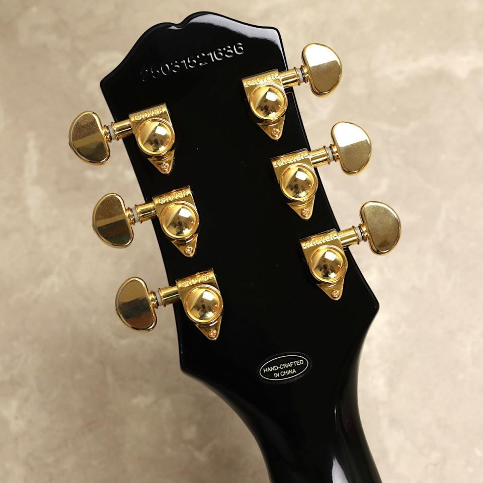 より本家Gibosnに近づいたヘッド形状、漆黒のエボニー指板とゴールドパーツのコントラストが高級感を引き立てます。