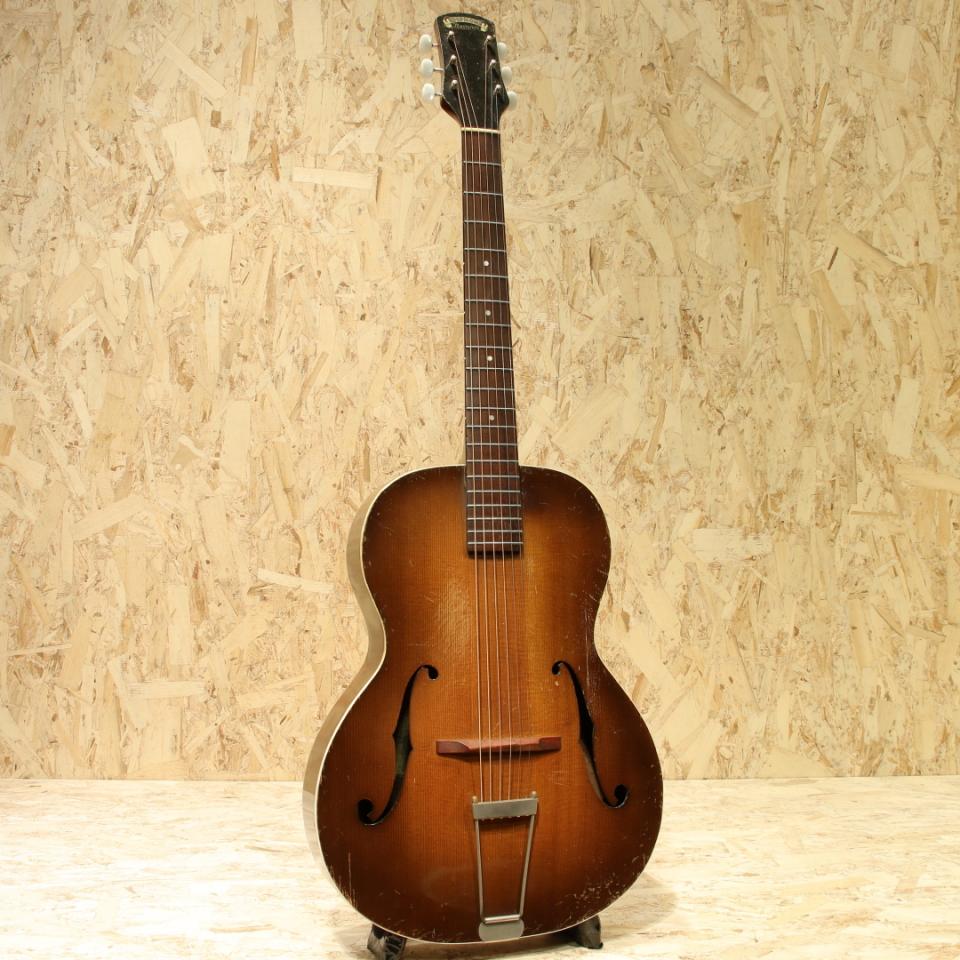 1873年の創業より長い歴史を持つエピフォンブランド。Stathopoulo期ニューヨークの地で名を馳せたアーチドトップ黄金期1930年代。美しい全体のフォルム、細部までこだわったディティールと全体で計算されたハイセンスなバランスのデザイン、良き時代の象徴です。オリジナリティーの高いサウンドも持ち、アーチドトップ界ではGIBSONと席巻し人気を博したEpiphoneですが、のちの1950年代晩年期、経営陣の不仲などにより徐々に衰退。1957年以降はライバル社であったギブソンに買収され、工場がカラマズーに統合されました。1930s黄金期時代の輝かしい作品は今もなお、アーチドトップを愛するジャズギタリストをはじめとしたコアなファンの心をつかんで止みません。本器は1935年製Masterbiltシリーズの"Olympic"。14 3/4ボディーワイド、ハンドカーブドスプルーストップ、マホガニーサイドバック、センターで継がれた2Pネック、ドット指板ポジション、ハカランダ指板、ホワイトセルバインディング。ピックガードと固定金具は欠損しております。1931年より発売されたOLYMPIC。発売当時は13インチボディでしたが、3度サイズが変わり年々大型化した経緯を持ちます。その後1949年には生産終了となりました。本器は2度目のサイズ変更のタイミングで製作が行われた個体。比較的安価な位置づけで製造が行われており、装飾もシンプルに抑えられた比較的小型なモデルになります。アーチトップではメイプルを使用されることも多いですが、本器はマホガニーを使用しまた一味違ったニュアンスを持つ1本。甘いというよりはドライ、ガランとしたマホガニー特有の響きを持ち、音の輪郭が空気に混じるようなエア感を持ったサウンド。耳にキンと来ない柔らかさを持ち、強めのピッキングでも音が纏まりやすい特色を持ったアーチトップです。ネックヒールキャップは欠損、ペグは近年のモノへ交換され片側4つある内のビス穴は2つネジが欠損しています。チューニング自体は問題なく行えるため実用上差し支えの無い状態です。1弦側Fホールの上部、くびれ付近に木部クラックが入った跡が見られますが丁寧に補修がされており、使用上問題ありません。ブリッジは当時のカタログと見比べても形状が異なる為、恐らくリプレイスされているかと思われます。ボディ縁の細やかなキズ、塗装剥げ、ヘッド裏の塗装が粘着テープに反応したであろう跡等長年使用されてきたであろう形跡が見られる貫禄のある個体。ネック自体は若干の順反りとなりますが、この時代の構造としてはストレートに近い良好な状態。ネックシェイプは現代から見てもさほど太さを感じづらく、弦高も現代的で弾きやすい演奏性に整えられており、まだまだ実用的な1本です。エピフォン黄金期に作られたアーチトップギター。現代とは異なる設計思想を感じられ、本格志向でありつつも入門に使える1本です。独特のアーチトップサウンド、是非この機会にいかがでしょうか。