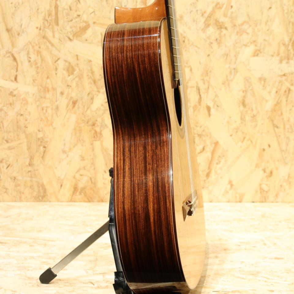 高知県にて製作を行っていた”岩田晃昌”氏、後に本名である”岩田博行”名義にて製作を行っておりましたが、惜しくも逝去されてしまった製作家です。”田村廣”氏の工房出身でもあり、とても寡作であることでも知られ、納得のいくモノだけしか世に出さないというポリシーだからこそ中々出回りません。本器は松/ローズ仕様にて製作が行われた1本。1975年製作のUSED品です。松トップ、ローズウッドサイド&バック、エボニー指板、ローズウッドブリッジ、花を模したであろうモザイクロゼッタ、ローズウッドバインディング、660mmスケール。”田村廣”氏も同じく高知県で製作を行っていた製作家であり、弟の満氏と共に製作を行っていました。一時期は工房にて量産を行っており、その後は僅かな本数を個人で製作。その工房で製作を担当していた内の一人が岩田氏となります。この時代によく見られる650mm以上、660mm前後の弦長。この時代は大型化による音量向上を図った時期とも言われ、ボディと弦長を全体的に大きくしたと言われています。実際に名器と呼ばれる楽器にもこの弦長を採用したものはあるため、1つの回答であったと言えるでしょう。80年代頃からは650mm弦長に落ち着き、現代においてもこのサイズ感を基準としています。松/ローズ仕様の為、明るく響きを特徴としている個体です。暖かさを感じるトーン、クリアな音色。やや弦長が長いながらも、テンション感は比較的柔らかく押弦しやすい操作性を備えています。現代では作ることは無いであろうこの時期特有の仕様で生み出された1本です。ボディトップ面に細やかな当てキズや擦れキズ、弾きキズなどは見られますが、大きな使用感は見られず良好な状態をキープされている個体。ネックにも大きな反りはなく、サドルの高さは少ないながらも弾きやすい弦高をキープされています。寡作の製作家ゆえに、まず見かけることの無い作品の1本。1975年の作品ともなると比較的初期の作品であることが推測されます。是非一度お試し下さいませ。