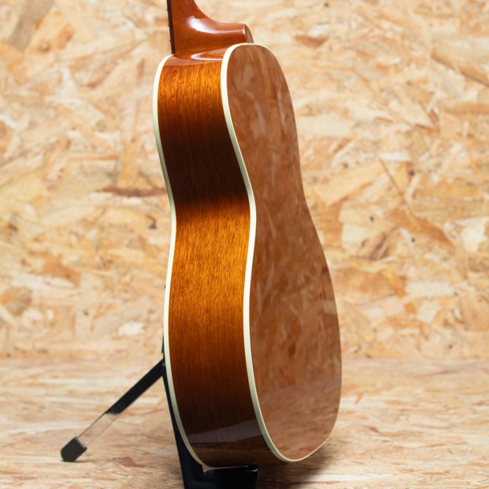 1932年に発表された歴史的銘器"L-00"の新基準のスタンダードモデル"L-00 Standard"。本器はヘリテージチェリーサンバーストフィニッシュにホワイトカラーのピックガードを採用した弊社オーダーモデルの1本。淡いボディの色味と白のピックガードがマッチした少し可愛らしさもある良いルックスに仕上がっています。シトカスプルーストップ、マホガニーサイド&バック、マホガニーネック、ローズウッド指板&レクタングルブリッジ、グローバーペグ(スモールノブ)、パールヘッドロゴ、スキャロップドXブレイシング、L.R.Baggs社製 Element VTCピックアップ標準装備。15インチ弱のコンパクトな薄胴ギターですが、フルボディのJ-45に迫るボリュームも合わせ持っています。指板サイドにはスムーズな運指をフォローする丸みを帯びた処理が施されています。搭載のPUは1ボリューム1トーン仕様のシンプルな操作でより幅広いユーザに向けて、より幅広いサウンドメイクが可能となります。歯切れ感の強い音で、気っ風がよく、サイズ感以上のボリュームを体感できます。ギブソンの味ともいえるサステイン短めのクリアなトーンが持ち味です。カントリーブルースやラグタイムなどの奏法や、ストロークとアルペジオを交えた弾き語りにも最適です。ステージなどでも映える、ルックス抜群のオーダー品です。