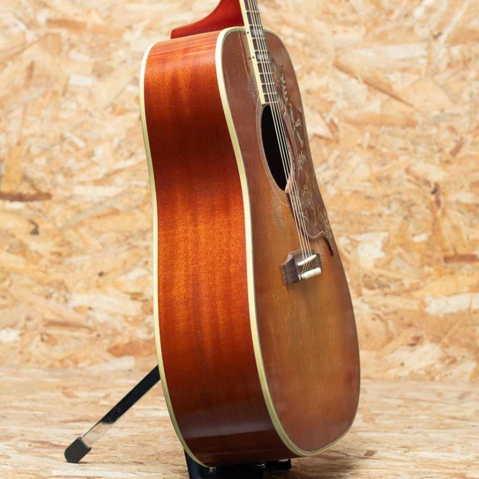 1960年にギブソン初のスクエア・ショルダーとしてリリースされたハミングバード。正に新時代の音楽へ向かう黎明期におけるデビューでした。そして瞬く間に、当時の音楽シーンを主導するミュージシャン達のお気に入りの相棒となり、現在まで続くギブソンの代表的人気モデルとなりました。本器は待望のギブソン「マーフィー・ラボ」アコースティックシリーズの「1960 Hummingbird Heavy Aged」。「エイジング」とは希少性が高く入手困難なヴィンテージ・ギターの風合いや塗装の剥がれなどを忠実に新製品上で再現する特殊な技術のことで、テネシー州ナッシュヴィルのギブソン・カスタムショップ内に新設された部門「マーフィー・ラボ」では、エイジングの第一人者でマスター・アルティザンのトム・マーフィーと彼の率いるチームが科学的検証に基づく最新の技術を駆使して、ギターのエイジングを行っています。サーマリーエイジドトップ、マホガニーサイドバック、マホガニーネック、ローズウッド指板&ブリッジ、ゴトー製キーストーンボタンゴールドペグ、ダブルパラレログラム指板インレイ、クラウンヘッドインレイ、ヘリテージチェリーサンバーストカラー。全体に施されたヘビーエイジド加工で、数十年の年月の経年をシュミレート。ピックによるスクラッチ傷やネック裏の塗装はがれ等、実際に経年を経てきたと錯覚するような驚くほどナチュラルなエイジング技術が施され、まさにヴィンテージの風格。また、エイジド加工は音質にも影響を与え、ドライでラウンドなヴィンテージサウンドをご堪能いただけます。ギブソン黄金期のオリジナル・モデルならではの個性、雰囲気、フィーリングが感じられる仕上がり。是非手に取ってみてください。