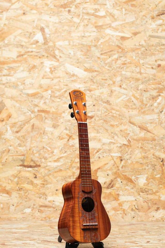 ハワイ製ウクレレブランドして人気を博した"G-String"。ハイビスカスデザインのレーザー彫刻が施されたハワイアンスタイルモデルUSED品。