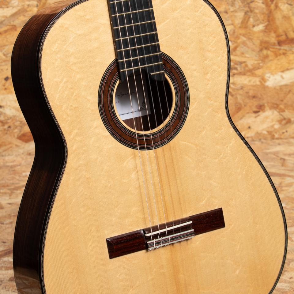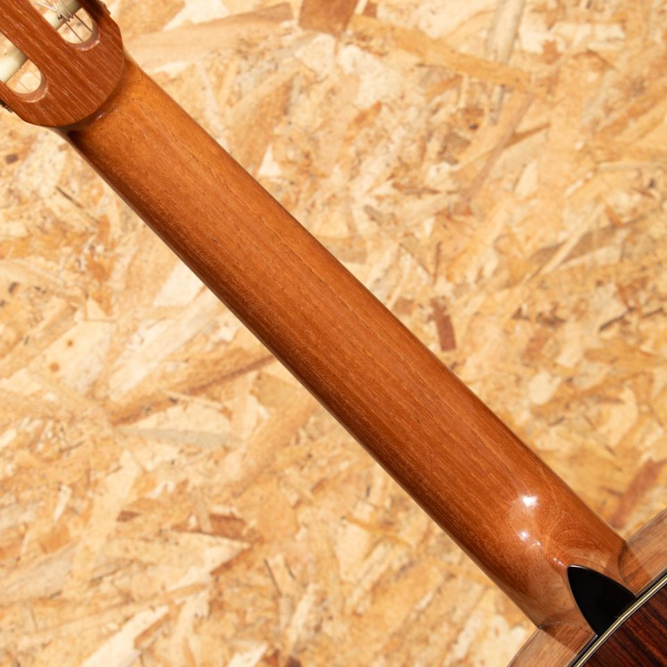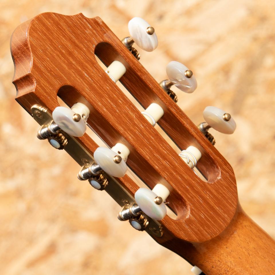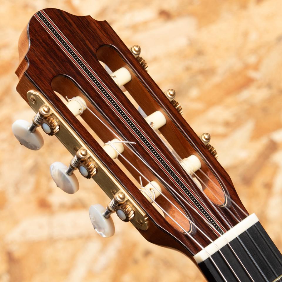イタリアのローマにて楽器を製作する新進気鋭作家クラウディア・フランチェスカ・ダンマッサ。ドメニコ・アショーネの指導の下、サンタ・チェチーリア音楽院でクラシック・ギターを学び、卒業後は本格的に楽器製作に専念。マリオ・ガローネとジュゼッペ・クズコーリ博士の指導の下、適切な機器と専用のコンピュータープログラムを使用して基板の共振を監視することにより、可能な限り科学的なアプローチで理論と製作技術の研究を洗練させ、クラシックギター製作の知識と専門知識を向上させました。イタリアの手工芸品の音楽分野で傑出したギターとして、オーストリア、ドイツ、英国、スイス、ブラジル、オーストラリア、メキシコ、米国、アラブ首長国連邦など、世界中の多くの国で評価されています。本器は2023年に製作されたUSED品。ベアクロウの木目が美しいスプルースダブルトップ、ローズウッド(外側)&マホガニー(内側)ダブルレイヤーサイド、ローズウッドバック、スパニッシュシダーネック、エボニー20フレット指板、ローズウッドブリッジ、アレッシーペグ、フレンチポリッシュフィニッシュ。科学的なアプローチと伝統的な音質の両立を掲げるこちらのギターは伝統的なファンブレーシングにパッチを重ねる革新的なアプローチが施されており、ダブルトップならではの非常に豊かな音量、太くたっぷりと響く低音と芯があり艶を感じさせるシルキーな高音をお楽しみいただけます。トップにごくごく薄いスクラッチ傷、ヘッド裏角の欠け補修がある他にダメージはなくネックコンディションも良好。3.5.7.9.12.15.17フレットにはポジションマークが施されております。ボディ背面は雰囲気を損なわない程度に薄く塗装の白濁がみられますが全体として非常にきれいな状態を保っています。また、弦長640ミリのショートスケール&ナット幅50ミリと手が小さい方で弾きやすい設定でありながらもスケールを感じさせない音質・音量を兼ね揃えた1本です。ハードケース付属。