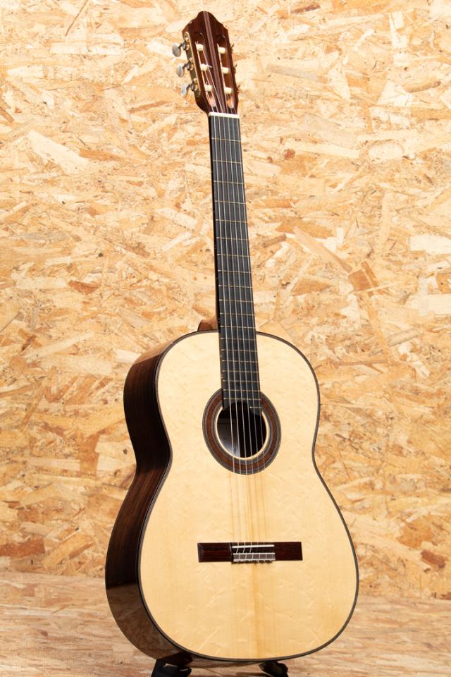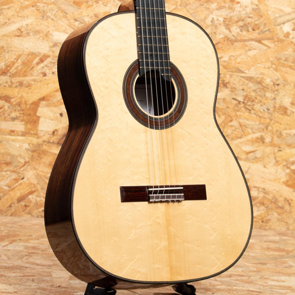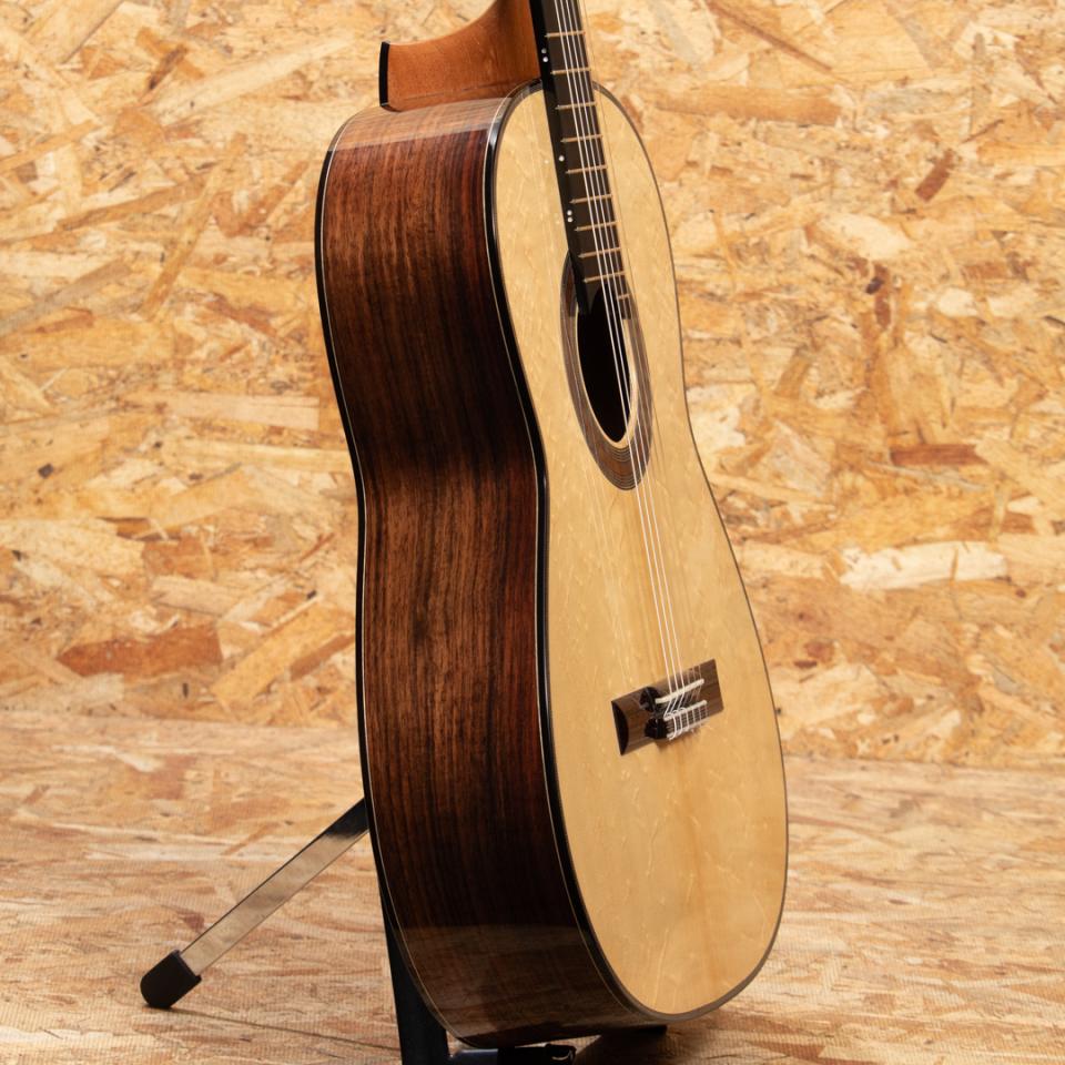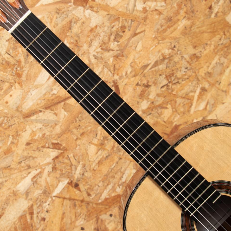 イタリアのローマにて楽器を製作する新進気鋭作家クラウディア・フランチェスカ・ダンマッサ。ドメニコ・アショーネの指導の下、サンタ・チェチーリア音楽院でクラシック・ギターを学び、卒業後は本格的に楽器製作に専念。マリオ・ガローネとジュゼッペ・クズコーリ博士の指導の下、適切な機器と専用のコンピュータープログラムを使用して基板の共振を監視することにより、可能な限り科学的なアプローチで理論と製作技術の研究を洗練させ、クラシックギター製作の知識と専門知識を向上させました。イタリアの手工芸品の音楽分野で傑出したギターとして、オーストリア、ドイツ、英国、スイス、ブラジル、オーストラリア、メキシコ、米国、アラブ首長国連邦など、世界中の多くの国で評価されています。本器は2023年に製作されたUSED品。ベアクロウの木目が美しいスプルースダブルトップ、ローズウッド(外側)&マホガニー(内側)ダブルレイヤーサイド、ローズウッドバック、スパニッシュシダーネック、エボニー20フレット指板、ローズウッドブリッジ、アレッシーペグ、フレンチポリッシュフィニッシュ。科学的なアプローチと伝統的な音質の両立を掲げるこちらのギターは伝統的なファンブレーシングにパッチを重ねる革新的なアプローチが施されており、ダブルトップならではの非常に豊かな音量、太くたっぷりと響く低音と芯があり艶を感じさせるシルキーな高音をお楽しみいただけます。トップにごくごく薄いスクラッチ傷、ヘッド裏角の欠け補修がある他にダメージはなくネックコンディションも良好。3.5.7.9.12.15.17フレットにはポジションマークが施されております。ボディ背面は雰囲気を損なわない程度に薄く塗装の白濁がみられますが全体として非常にきれいな状態を保っています。また、弦長640ミリのショートスケール&ナット幅50ミリと手が小さい方で弾きやすい設定でありながらもスケールを感じさせない音質・音量を兼ね揃えた1本です。ハードケース付属。