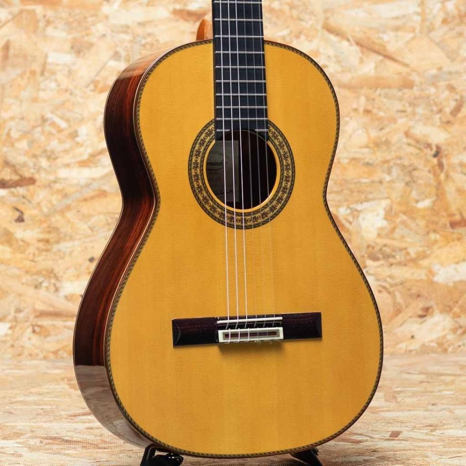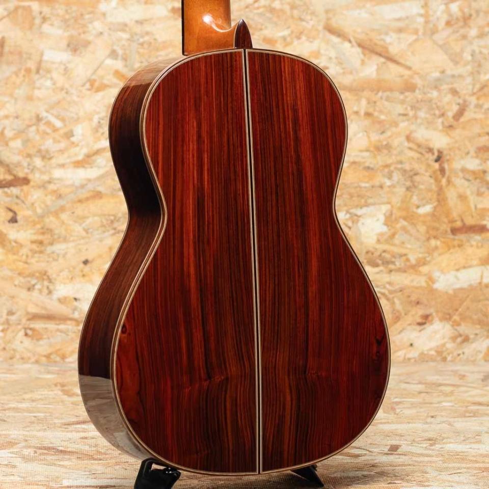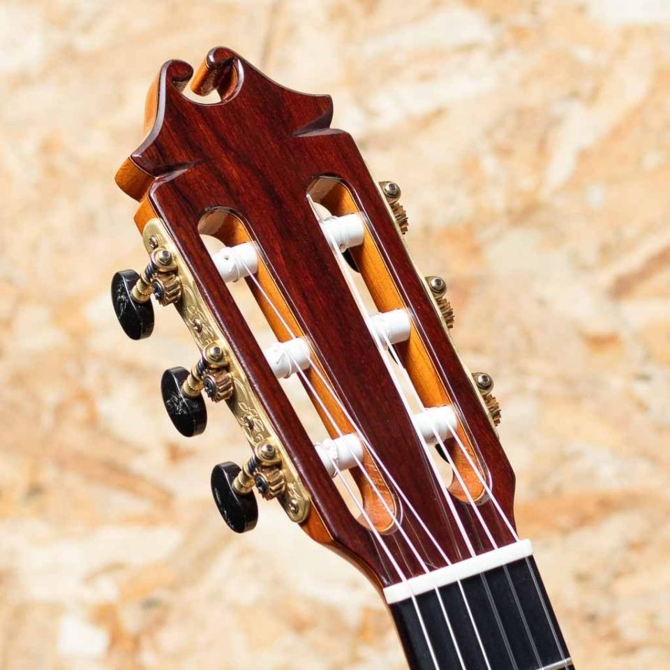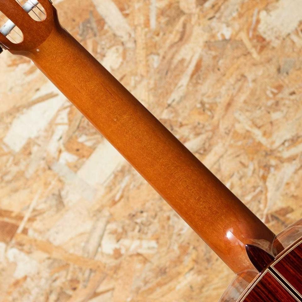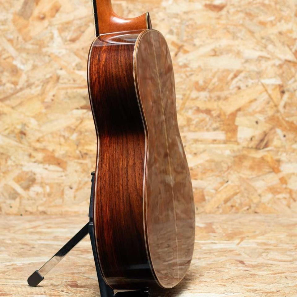 スペイン・バレンシア地方に小さな工房を開く"Juan Hernandez(ホアン・エルナンデス)"。伝統的な製法にこだわり、製作家、ホアン・エルナンデスを筆頭に四、五人の職人でクオリティの高いギターが小規模に製作されています。丹念に作り込まれた楽器にしか表れないなめらかな質感で、とてもやわらかな佇まいも魅力的です。本器はハカランダを使用したエルナンデスの最高級モデル”MAESTRO”。スプルーストップ、ココボロサイド&バック、エボニー指板、ローズウッドブリッジ、モザイクロゼッタ&トリム、ローズウッドバインディング。630mmスケールにて仕上げられた本器、弱すぎず程良いテンション感は押弦時のストレスを軽減。ショートスケールながら安定した撥音。雑味の無い開放的な響きで、音抜けが良く立ち上がりや反応も軽快。芯の通ったハッキリとした高音が美しく、メロディを繊細に煌びやかに表現することができます。ネック裏面に一か所爪が当たったような小さな傷、ボディバインディングに小さな当て傷、ヘッド表のナット付近に表面的な傷がございますが、目立つような打痕や傷は見られず、全体的に使用感は薄く、まだまだきれいな状態です。ショートスケールのため手の小さい方にもおすすめの1本です。セミハードケース付属。
