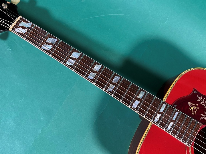 今回の楽器は特に人気の高い60年代後期にあたる68年モデルで、やや細目のナローネック、鮮やかな色合いのチェリーサンバーストでピックガードがビス止めです。