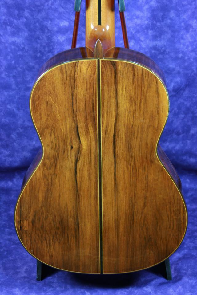 このギターの表面板にはラミレスの看板であるシダーを使い、サイドバックにはハカランダ、横板の内側には音を柔らかくするためにシープレスが貼り付けてあります。