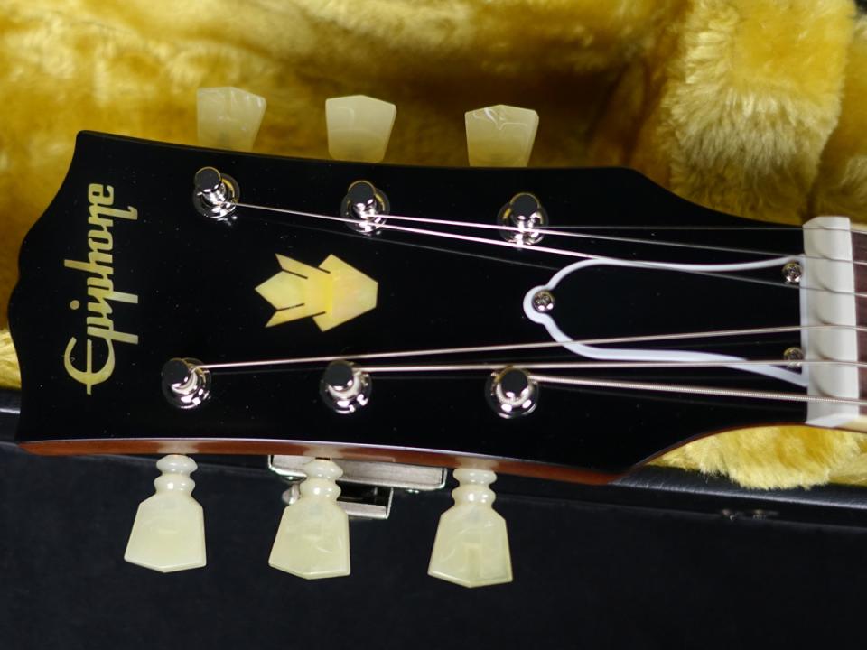 ヘッドストックにはGibsonスタイルの“オープンブック”デザインを採用し、EpiphoneロゴとGibsonクラウン・インレイをエイジド・マザー・オブ・パールで装飾。