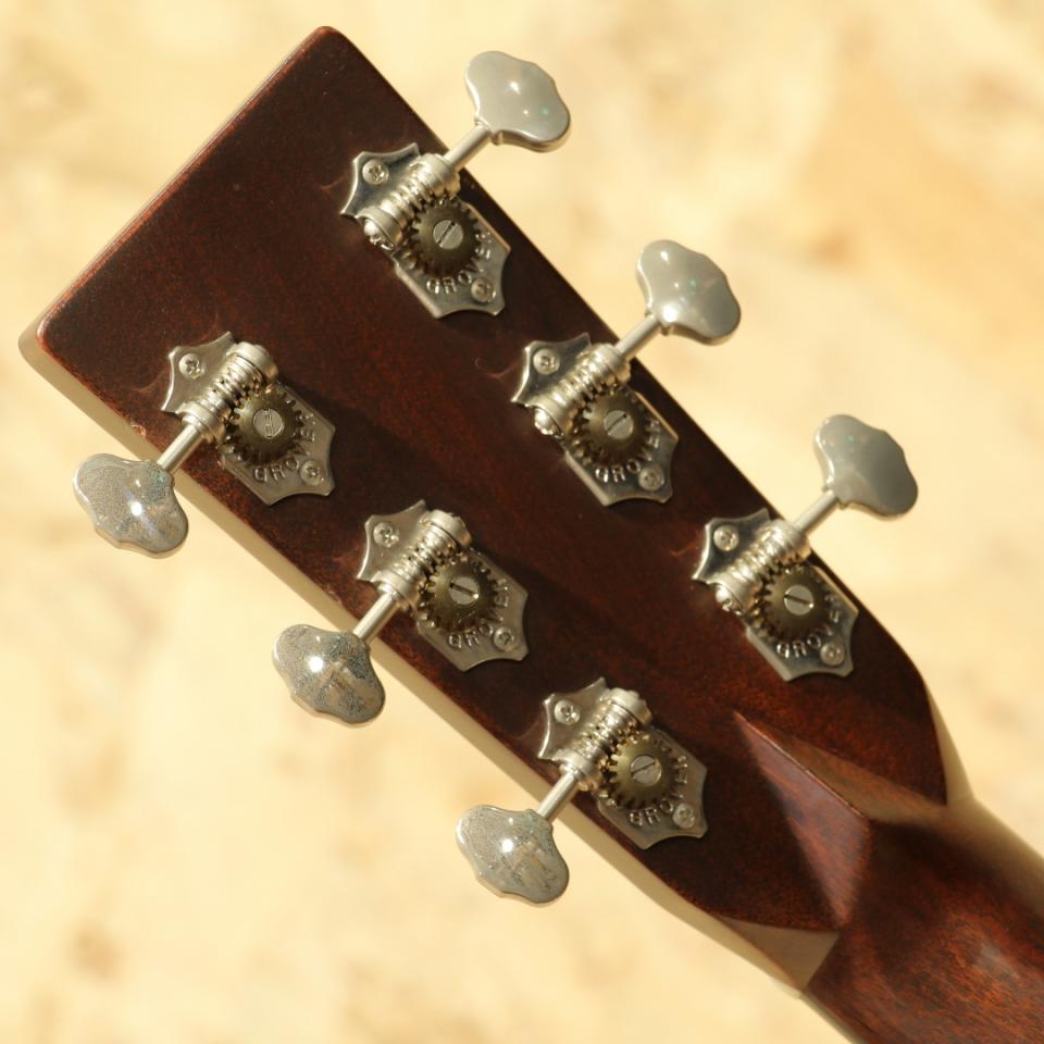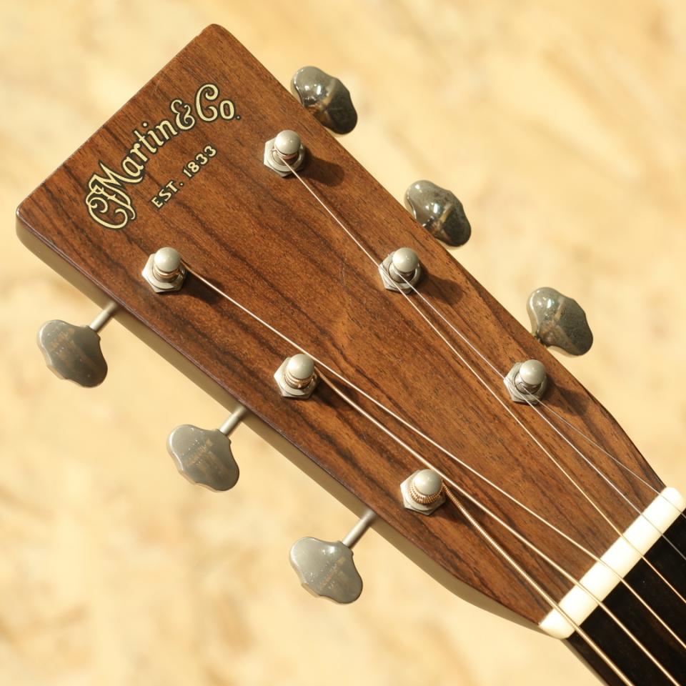 マーチンギターの中で最も有名なモデル"D-28"。現在同様の14fジョイントのドレッドモデルとして1934年に誕生してから、時を超え今もなお愛されるワールドスタンダードモデルです。本器は2021年製の1本。程よく焼けた飴色のスプルーストップ、イーストインディアンローズウッドサイド&バック、エボニー指板&ブリッジ、グローバーオープンバックペグ、パール指板ドット、べっ甲柄ピックガード、ノンスキャロップド・フォワードシフテッドXブレイシング。2017年からはギヤの見えるペグにべっ甲柄のピックガード等のオールドマーチンを思わせる外観。そこに様々なスタイルに対応できる演奏性や汎用性などを織り交ぜた現代的なアプローチ。戦前スペックと現代スペックを織り交ぜ、ハイブリッドな仕様にブラッシュアップされました。特筆すべきはブレイシング構造の変更、ブレイシングの交点をサウンドホール側にずらすフォワードシフトとブレイシングを削り込まないノンスキャロップ。これまでフォワードシフトはスキャロップが施されており、ノンスキャロップはスタンダードXかリアシフトの構造のみでした。それ等をミックスさせマーチンの歴史上これまで無かった新たな試みのパターンです。ネックはローオーバルシェイプで、直前のモデルに比べて少し薄目でしっかりした弧の字型になっています。指板幅が広くなったおかげでハイポジションまで弦間の広がりギャップが少なく、指板上を大きく行き来するフィンガースタイルプレイヤーにもストレスが掛かりにくくなっています。D28の特徴とも言うべきパワフルな低音やクリアな高音、それらを継承しながら深化したサウンド。より押し出し感の強い出音、ドライブ感のあるトーンはD-28ならでは。そこから前述の構造によりふくよかさを与えられ、空気感を含んだ音色を響かせてくれます。アタックの強いパンチ感やサウンドレンジの広さも健在、多彩なシチュエーションで対応できるオールマイティさや表現幅の広い仕様に仕上がっています。バックバインディングの両くびれに接着修正跡が見られますが、しっかりとリペアされています。ボディトップ面下部に細かな当てキズ、6弦側サイド面にいくつかのへこみキズ、バック面には細々とした擦れキズやバックルキズ、ヘッドの角にも僅かな当てキズや金属パーツのくすみなど若干の使用感こそ見られますが、全体を通してキレイなコンディションがキープされた個体です。ネックの状態は整えられ、現状扱いやすいセッティング。ゴールデンエラ期の良いところと現代に要求される演奏性を掛け合わせた現代のスタンダード。現在の最新仕様とも異なるこの時期ならではのクリアで芯のある音色。是非お手元でご体感ください。オリジナルハードケースが付属します。