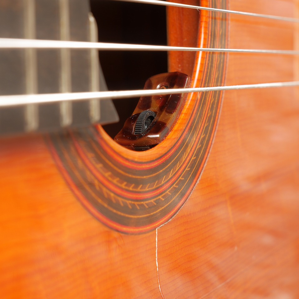 ピックアップを搭載したコンデ・エルマノスのフラメンコギター。速いレスポンスと硬質なアタック感を備えた1本。