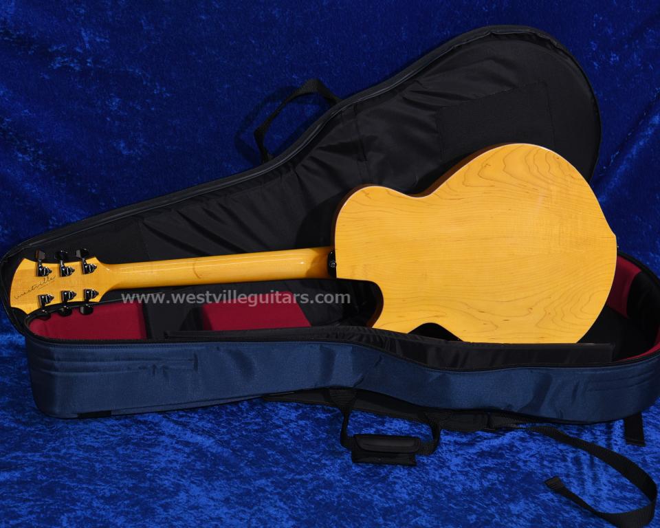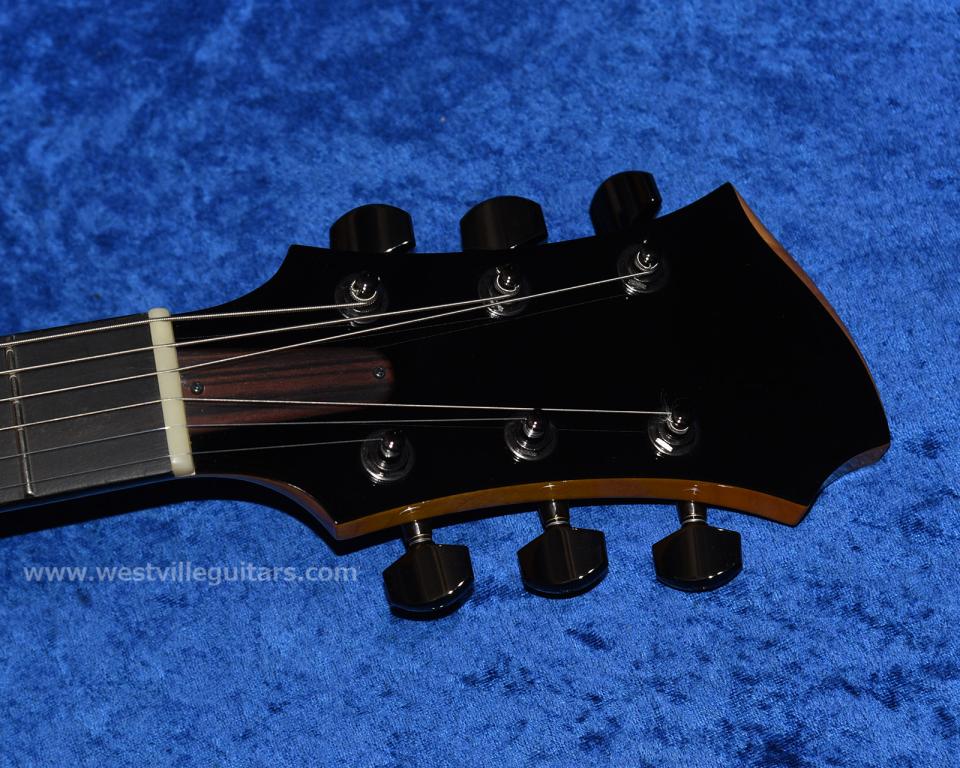 小ぶりなアーチトップ・ギターはヘッド側にウェイトが偏りがちな傾向がありますが、Westville Solarは前述の構造を用いたボディを採用することにより、約3.3kg程度に仕上げられておりますので、ストラップを用いる際も、またストラップ無しで演奏する際でも、そうしたウェイト・バランス(ヘッド落ち)を意識することなく、自然にプレイに集中することが出来ます。