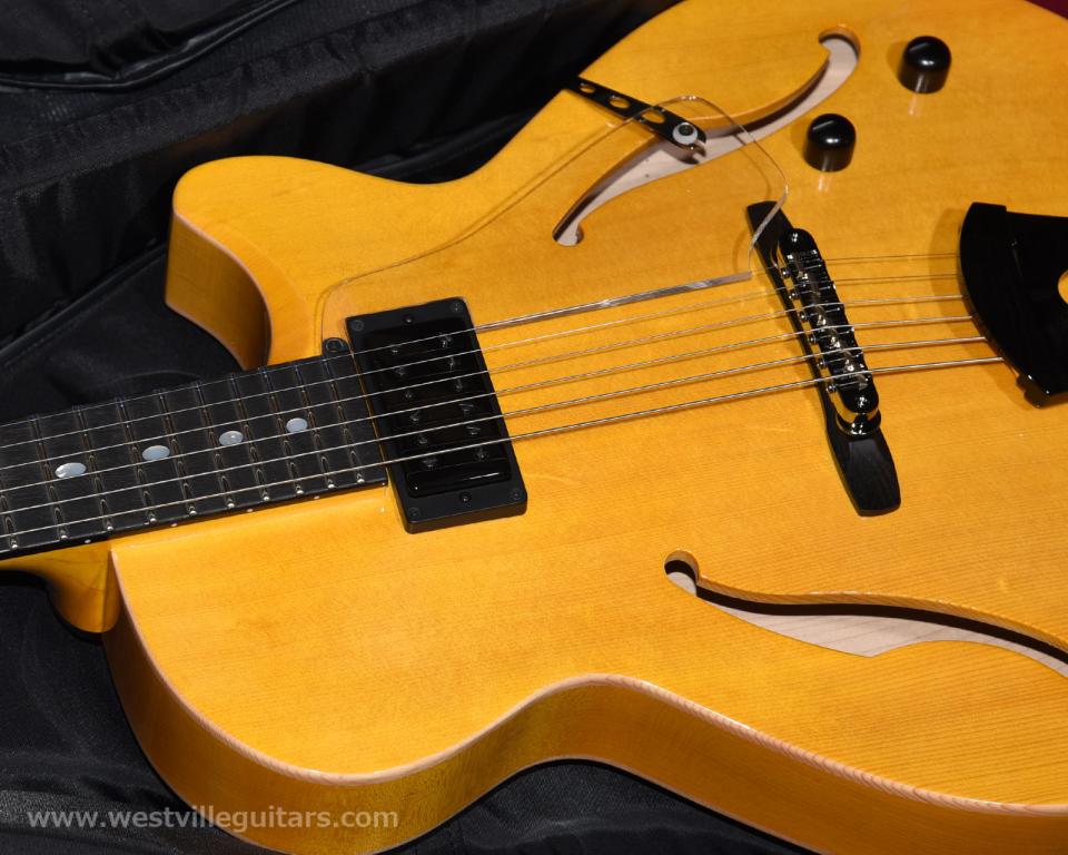 ボディトップは削り出し単板のシトカ・スプルース、ボディバックは同じく削り出し単板のハード・メイプル。そしてなんと、ボディサイドもハードメイプル単板材からの削り出し(くり抜き)構造!テイルピースはそのボディサイドと一体構造でくり抜かれたエンドブロック部分にダイレクト・マウントされ、剛性感が有り、かつ繊細なピッキングのニュアンスにもレスポンス良くリニアに反応する、全く新しい感覚のフルホロウ・モデルに仕上がっております。