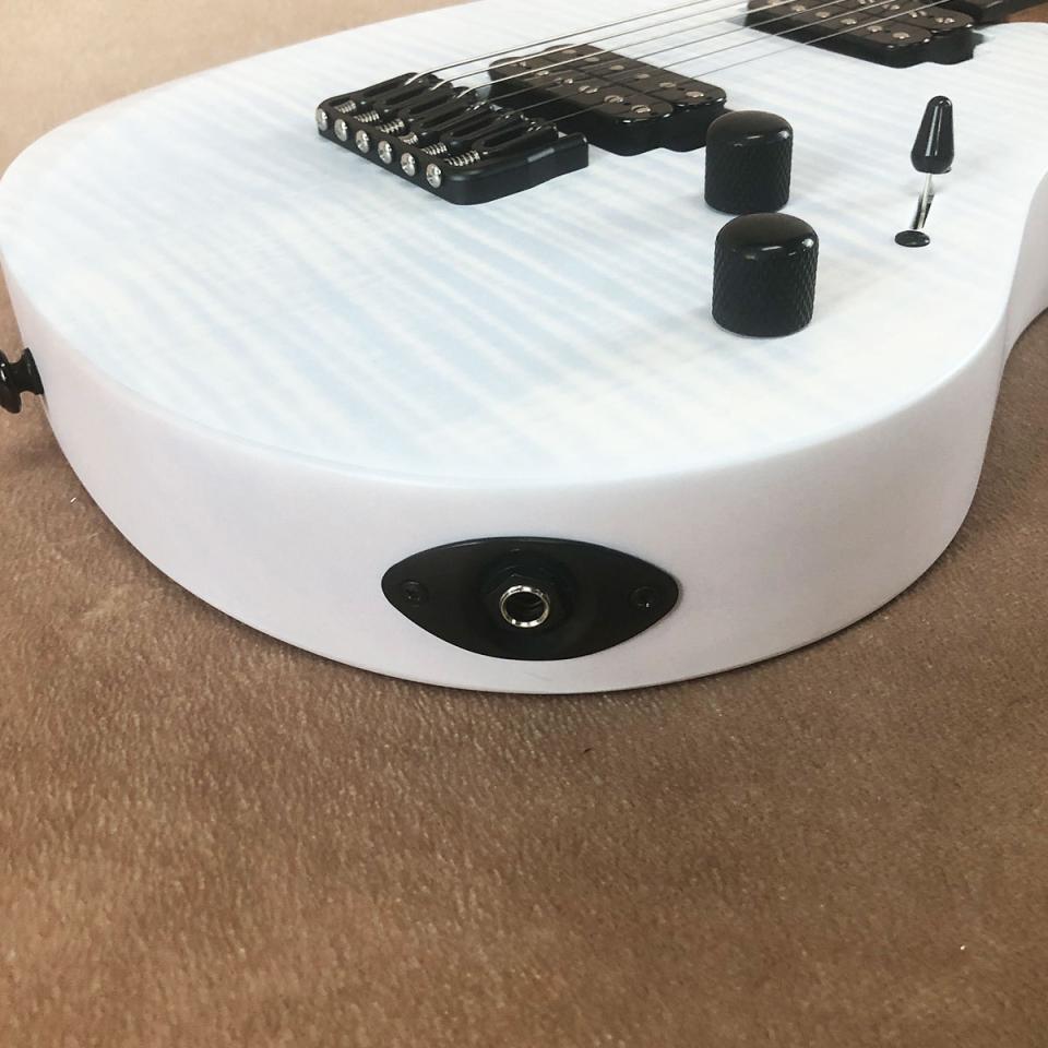 ボディーはフレイム・メイプル・トップ&マホガニーで、エルボー・カットやバック・カット、ストレスのないハイフレットへのアクセスを可能にしたフロント側とバック側カッタウェイのスクープ・カットを採用し、非常に演奏性の高いデザインです。